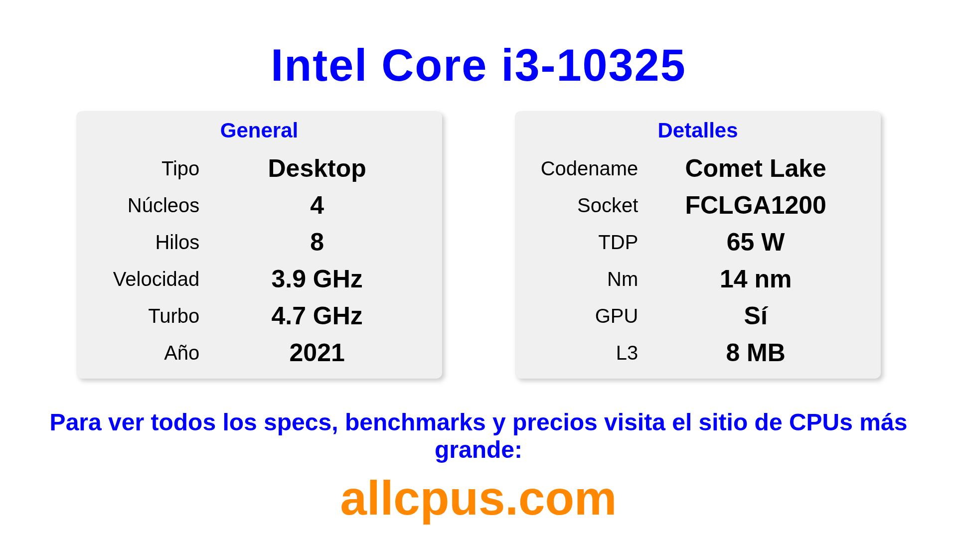 El Intel Core i3-10325 es un procesador de escritorio de Intel de la gama Intel Core, basado en la arquitectura Comet Lake y lanzado en 2021. Esta CPU cuenta con 4 núcleos, una frecuencia base de 3900 MHz, una frecuencia turbo máxima de 4700 MHz y 8 MB de caché L3. Fabricado usando tecnología de proceso de 14 nm.El Intel Core i3-10325 está diseñado para el socket LGA1200. Incluye gráficos integrados Intel® UHD Graphics 630.