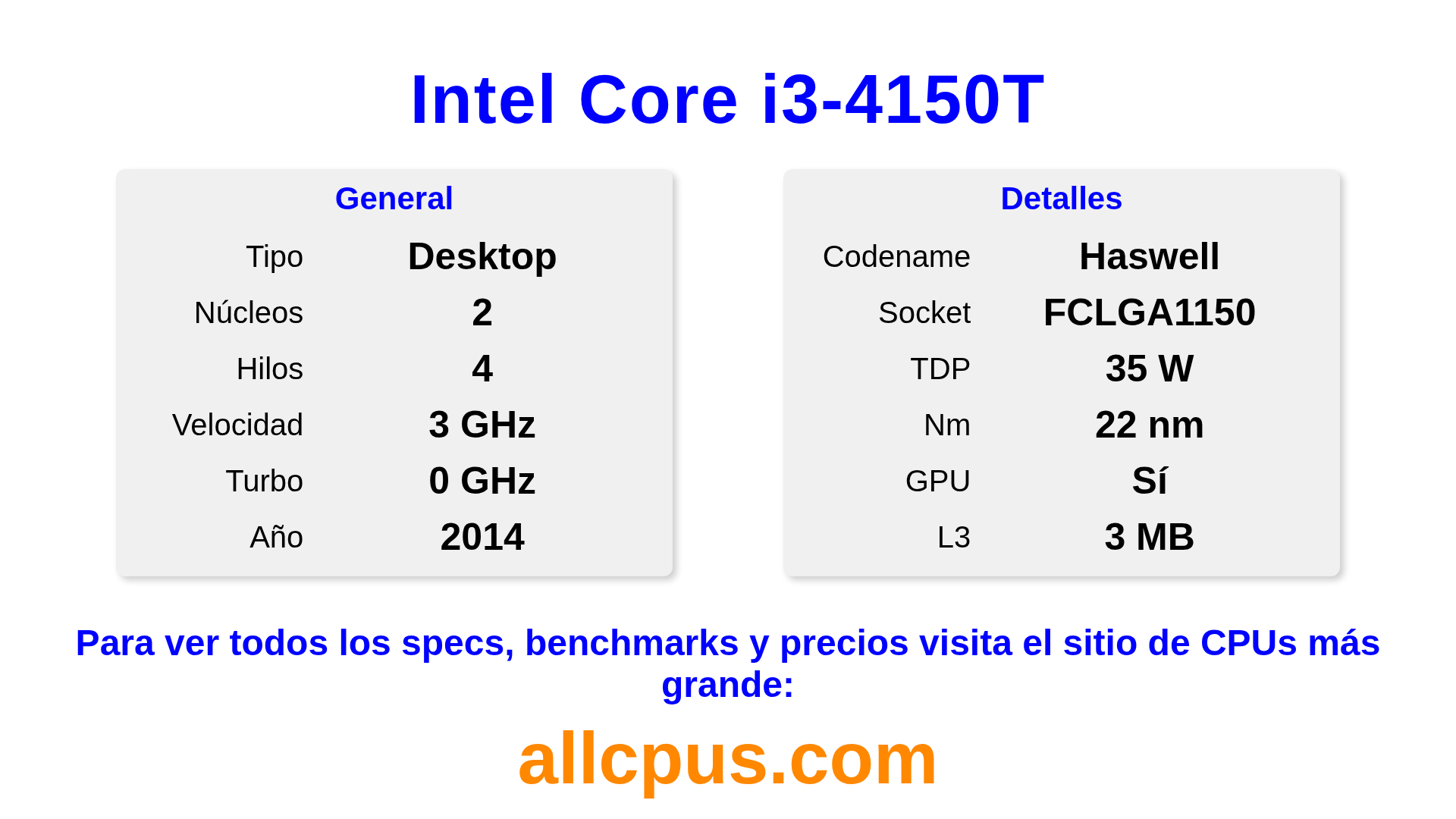 El Intel Core i3-4150T es un procesador de escritorio de Intel de la gama Intel Core, basado en la arquitectura Haswell y lanzado en 2014. Esta CPU cuenta con 2 núcleos, una frecuencia base de 3000 MHz, una frecuencia turbo máxima de 0 MHz y 3 MB de caché L3. Fabricado usando tecnología de proceso de 22 nm.El Intel Core i3-4150T está diseñado para el socket LGA1150. Incluye gráficos integrados Intel® HD Graphics 4400.