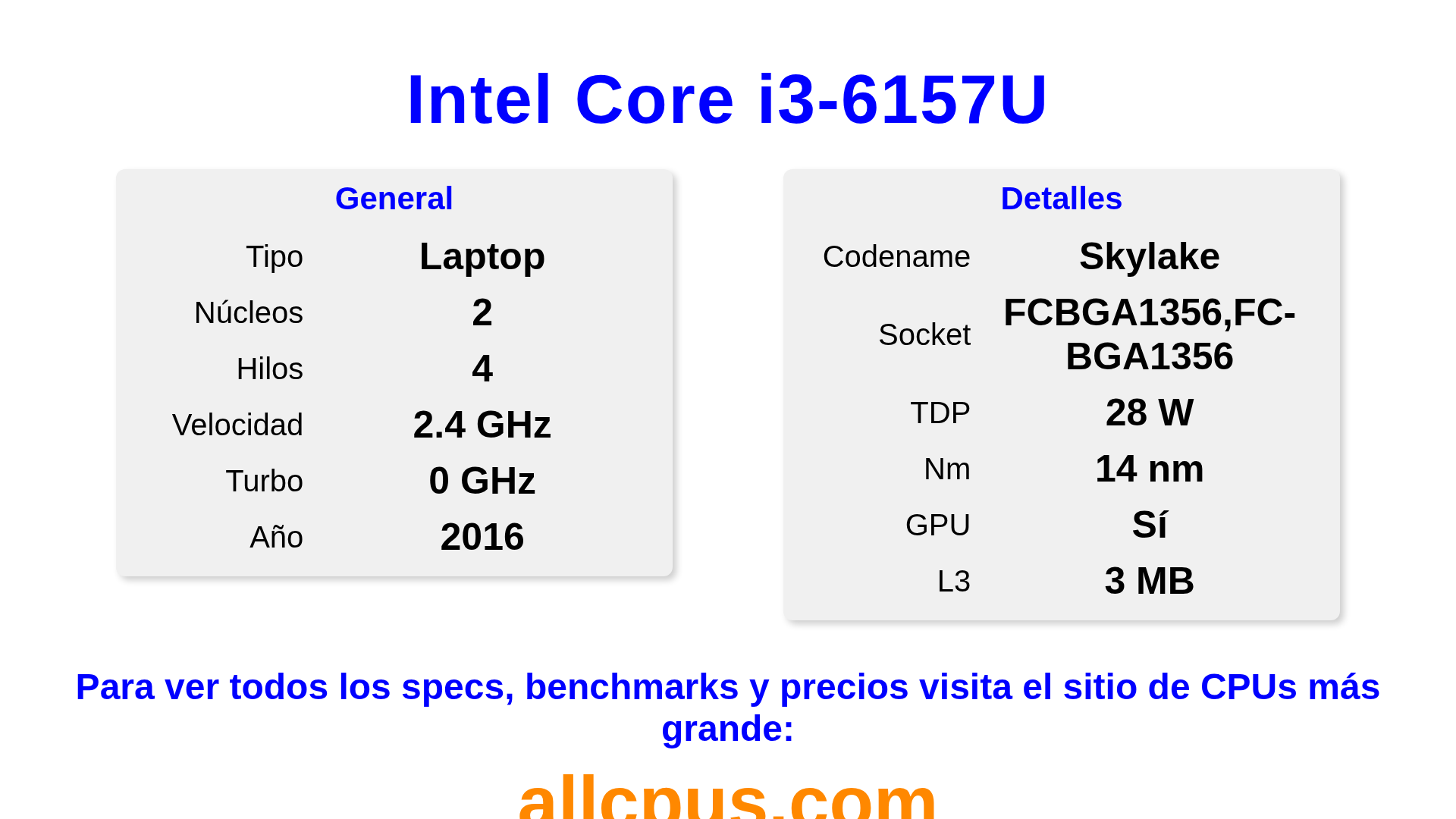 El Intel Core i3-6157U es un procesador portátil de Intel de la gama Intel Core, basado en la arquitectura Skylake y lanzado en 2016. Esta CPU cuenta con 2 núcleos, una frecuencia base de 2400 MHz, una frecuencia turbo máxima de 0 MHz y 3 MB de caché L3. Fabricado usando tecnología de proceso de 14 nm.El Intel Core i3-6157U está diseñado para el socket BGA1356,FC-BGA1356. Incluye gráficos integrados Intel® Iris® Graphics 550.