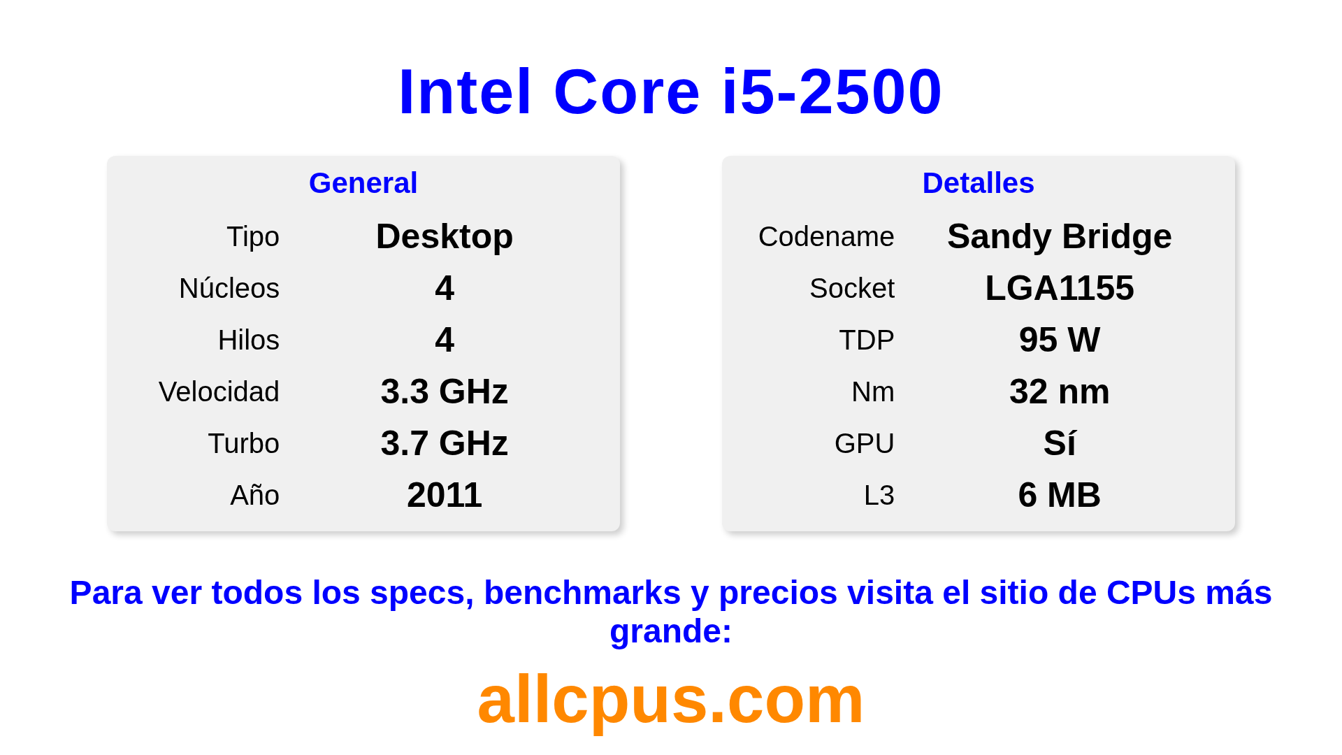 El Intel Core i5-2500 es un procesador de escritorio de Intel de la gama Intel Core, basado en la arquitectura Sandy Bridge y lanzado en 2011. Esta CPU cuenta con 4 núcleos, una frecuencia base de 3300 MHz, una frecuencia turbo máxima de 3700 MHz y 6 MB de caché L3. Fabricado usando tecnología de proceso de 32 nm.El Intel Core i5-2500 está diseñado para el socket LGA1155. Incluye gráficos integrados Intel® HD Graphics 2000.