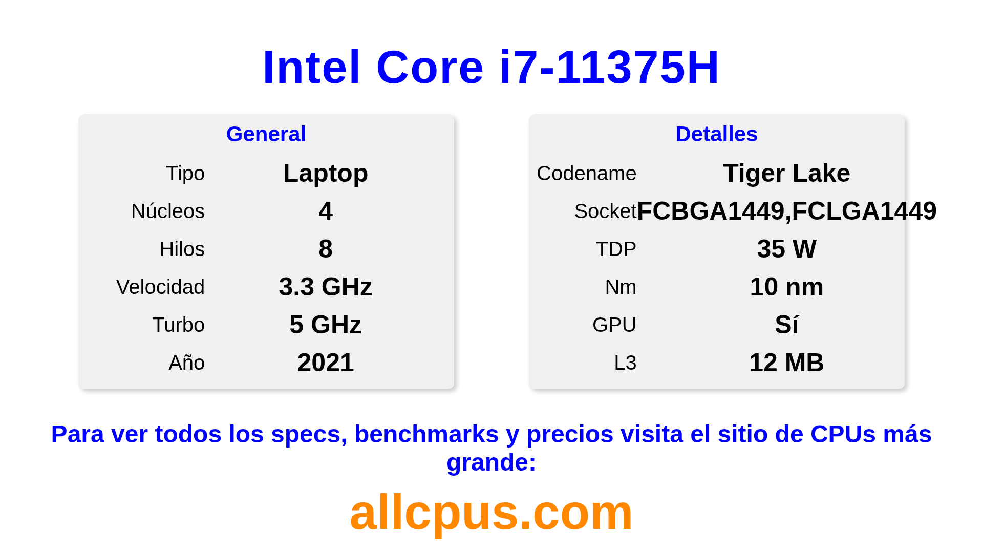 El Intel Core i7-11375H es un procesador portátil de Intel de la gama Intel Core, basado en la arquitectura Tiger Lake y lanzado en 2021. Esta CPU cuenta con 4 núcleos, una frecuencia base de 3300 MHz, una frecuencia turbo máxima de 5000 MHz y 12 MB de caché L3. Fabricado usando tecnología de proceso de 10 nm.El Intel Core i7-11375H está diseñado para el socket BGA1449,FCLGA1449. Incluye gráficos integrados Intel® Iris® Xe Graphics.