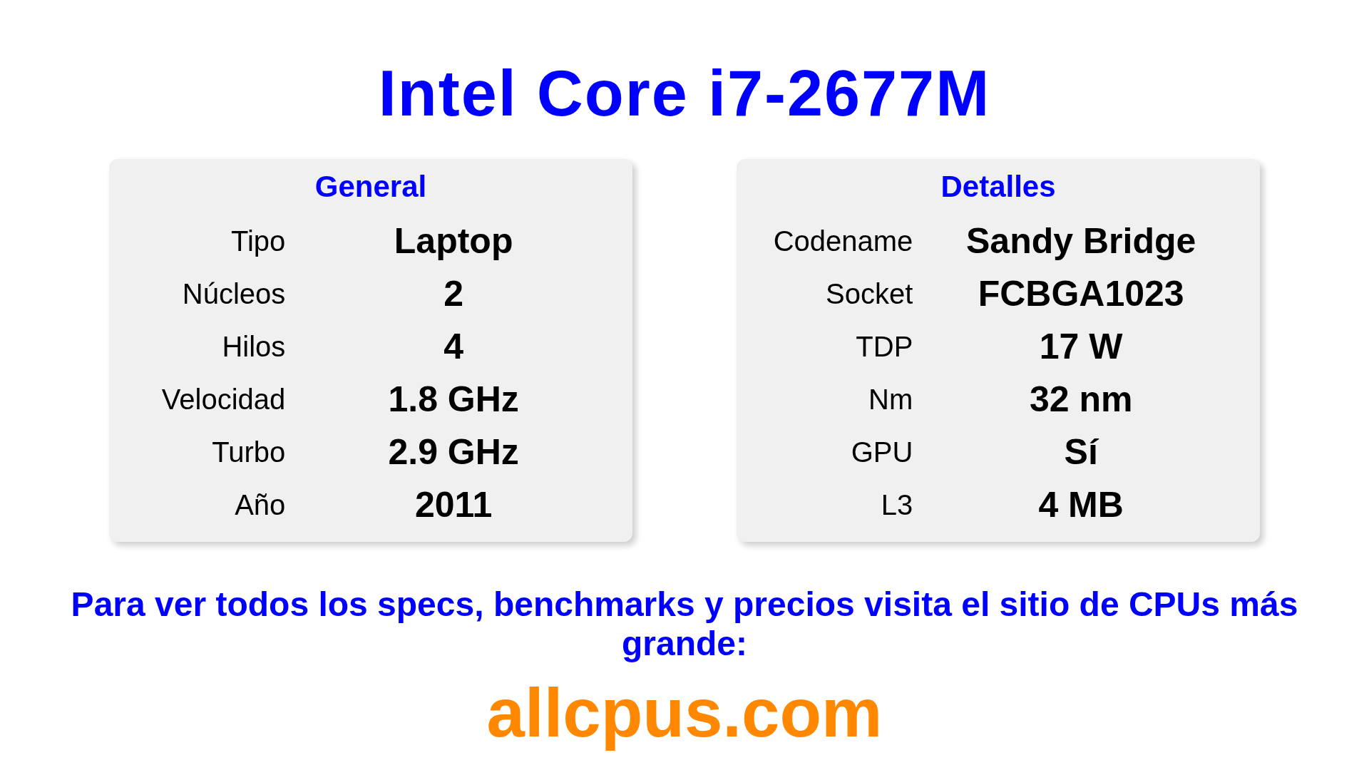 El Intel Core i7-2677M es un procesador portátil de Intel de la gama Intel Core, basado en la arquitectura Sandy Bridge y lanzado en 2011. Esta CPU cuenta con 2 núcleos, una frecuencia base de 1800 MHz, una frecuencia turbo máxima de 2900 MHz y 4 MB de caché L3. Fabricado usando tecnología de proceso de 32 nm.El Intel Core i7-2677M está diseñado para el socket BGA1023. Incluye gráficos integrados Intel® HD Graphics 3000.