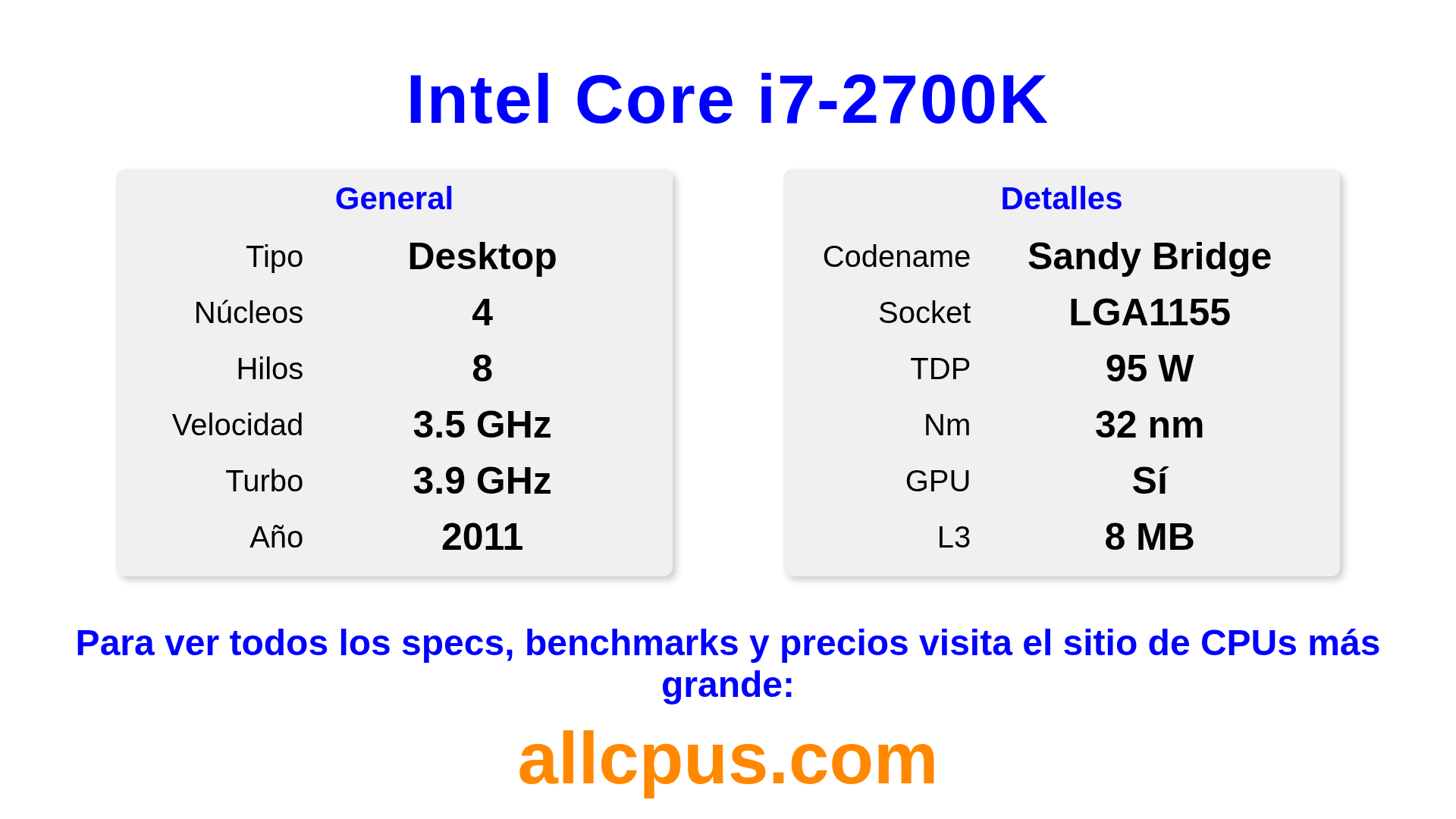 El Intel Core i7-2700K es un procesador de escritorio de Intel de la gama Intel Core, basado en la arquitectura Sandy Bridge y lanzado en 2011. Esta CPU cuenta con 4 núcleos, una frecuencia base de 3500 MHz, una frecuencia turbo máxima de 3900 MHz y 8 MB de caché L3. Fabricado usando tecnología de proceso de 32 nm.El Intel Core i7-2700K está diseñado para el socket LGA1155.Admite overclocking. Incluye gráficos integrados Intel® HD Graphics 3000.
