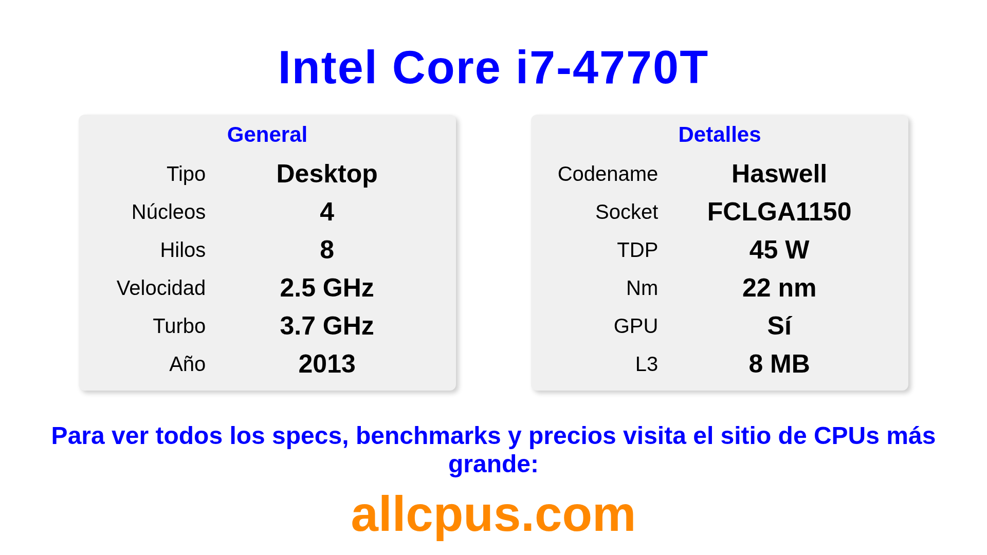 El Intel Core i7-4770T es un procesador de escritorio de Intel de la gama Intel Core, basado en la arquitectura Haswell y lanzado en 2013. Esta CPU cuenta con 4 núcleos, una frecuencia base de 2500 MHz, una frecuencia turbo máxima de 3700 MHz y 8 MB de caché L3. Fabricado usando tecnología de proceso de 22 nm.El Intel Core i7-4770T está diseñado para el socket LGA1150. Incluye gráficos integrados Intel® HD Graphics 4600.