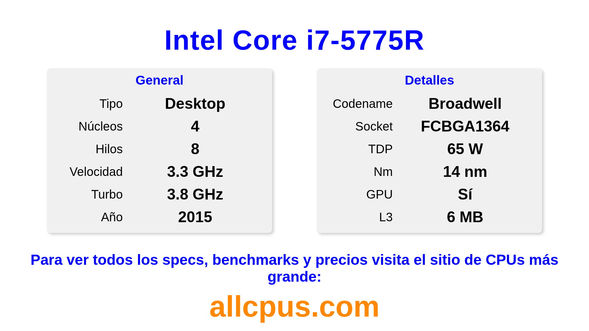 El Intel Core i7-5775R es un procesador de escritorio de Intel de la gama Intel Core, basado en la arquitectura Broadwell y lanzado en 2015. Esta CPU cuenta con 4 núcleos, una frecuencia base de 3300 MHz, una frecuencia turbo máxima de 3800 MHz y 6 MB de caché L3. Fabricado usando tecnología de proceso de 14 nm.El Intel Core i7-5775R está diseñado para el socket BGA1364. Incluye gráficos integrados Intel® Iris® Pro Graphics 6200.
