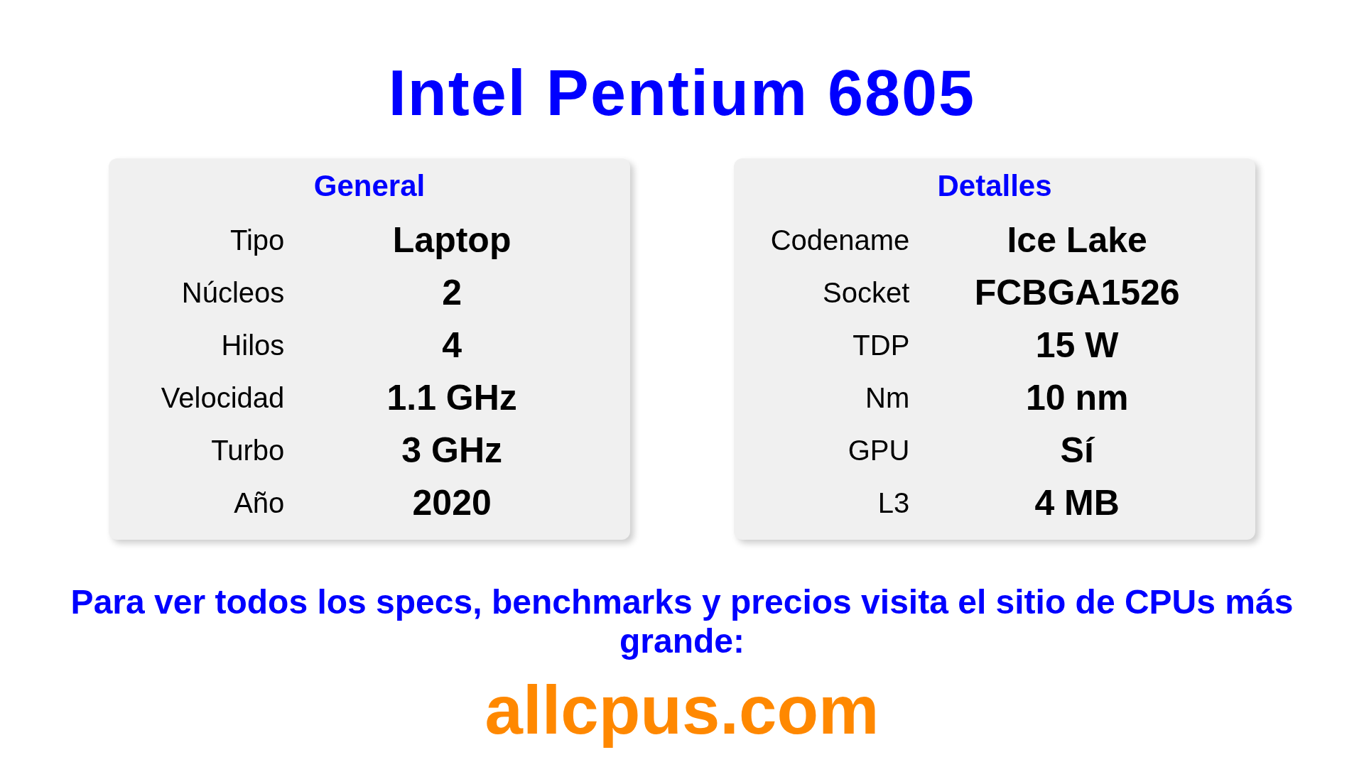 El Intel Pentium 6805 es un procesador portátil de Intel de la gama Intel® Pentium®, basado en la arquitectura Ice Lake y lanzado en 2020. Esta CPU cuenta con 2 núcleos, una frecuencia base de 1100 MHz, una frecuencia turbo máxima de 3000 MHz y 4 MB de caché L3. Fabricado usando tecnología de proceso de 10 nm.El Intel Pentium 6805 está diseñado para el socket BGA1526. Incluye gráficos integrados Intel® UHD Graphics for 10th Gen Intel® Processors.