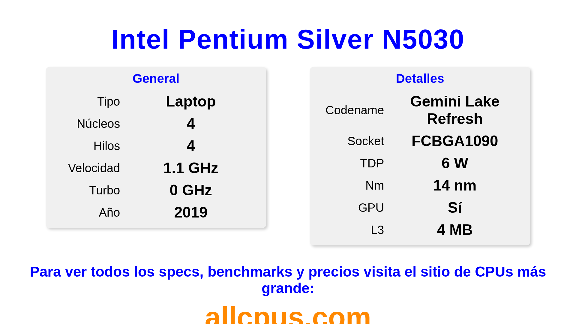 El Intel Pentium Silver N5030 es un procesador portátil de Intel de la gama Intel® Pentium® Silver, basado en la arquitectura Gemini Lake Refresh y lanzado en 2019. Esta CPU cuenta con 4 núcleos, una frecuencia base de 1100 MHz, una frecuencia turbo máxima de 0 MHz y 4 MB de caché L3. Fabricado usando tecnología de proceso de 14 nm.El Intel Pentium Silver N5030 está diseñado para el socket BGA1090. Incluye gráficos integrados Intel® UHD Graphics 605.