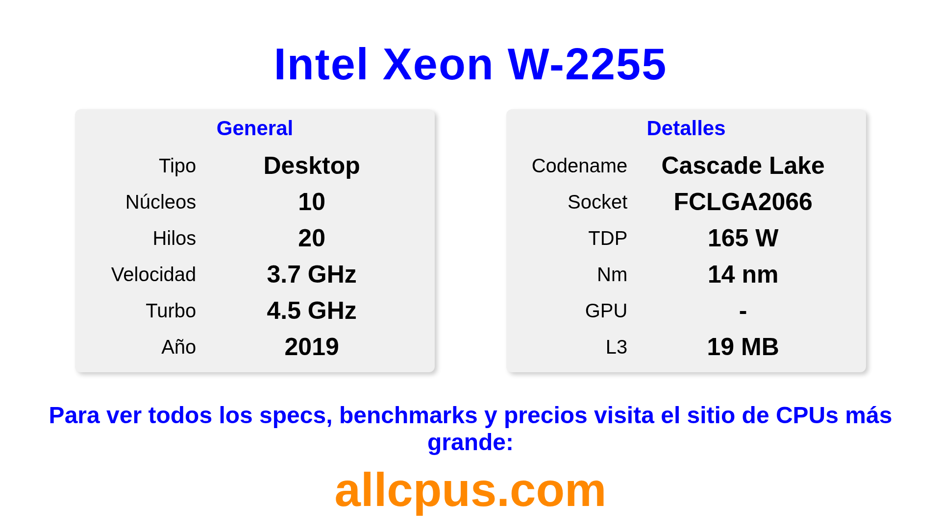 El Intel Xeon W-2255 es un procesador de escritorio de Intel de la gama Intel Xeon, basado en la arquitectura Cascade Lake y lanzado en 2019. Esta CPU cuenta con 10 núcleos, una frecuencia base de 3700 MHz, una frecuencia turbo máxima de 4500 MHz y 19 MB de caché L3. Fabricado usando tecnología de proceso de 14 nm.El Intel Xeon W-2255 está diseñado para el socket LGA2066. Se requiere una tarjeta gráfica dedicada.