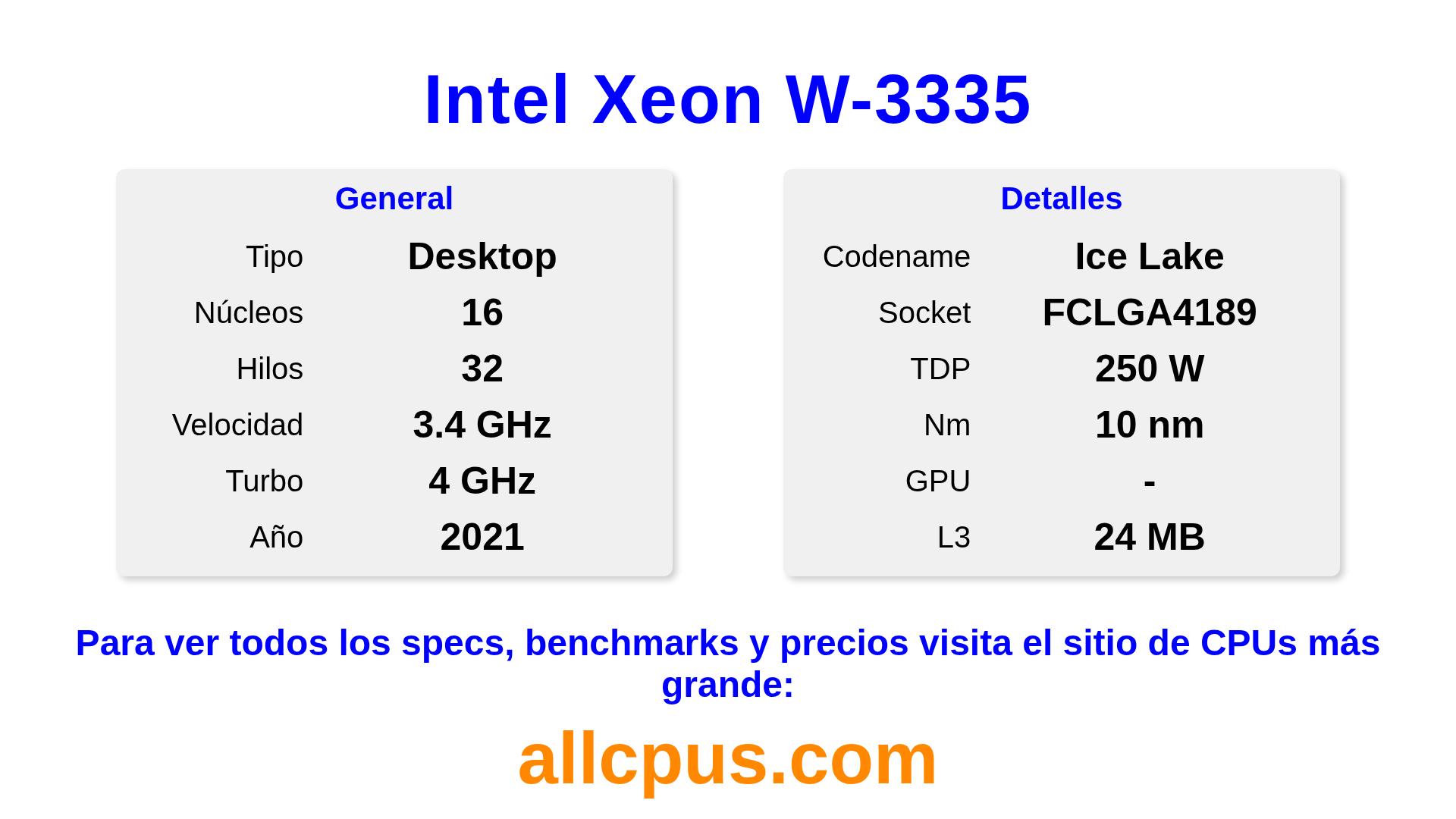 El Intel Xeon W-3335 es un procesador de escritorio de Intel de la gama Intel Xeon, basado en la arquitectura Ice Lake y lanzado en 2021. Esta CPU cuenta con 16 núcleos, una frecuencia base de 3400 MHz, una frecuencia turbo máxima de 4000 MHz y 24 MB de caché L3. Fabricado usando tecnología de proceso de 10 nm.El Intel Xeon W-3335 está diseñado para el socket LGA4189. Se requiere una tarjeta gráfica dedicada.