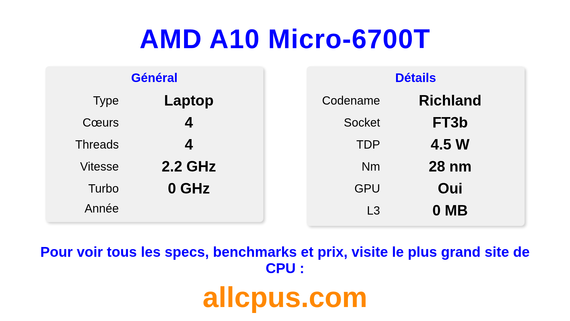 Le AMD A10 Micro-6700T est un AMD processeur portable de la gamme A-Series, basé sur l’architecture Richland et sorti en . Ce CPU dispose de 4 cœurs, une fréquence de base de 2200 MHz, fréquence turbo max de 0 MHz et 0 Mo de cache L3. Fabriqué avec la technologie 28 nm. Le AMD A10 Micro-6700T est conçu pour le socket FT3b. Il inclut les graphiques intégrés AMD Radeon R6 Graphics.