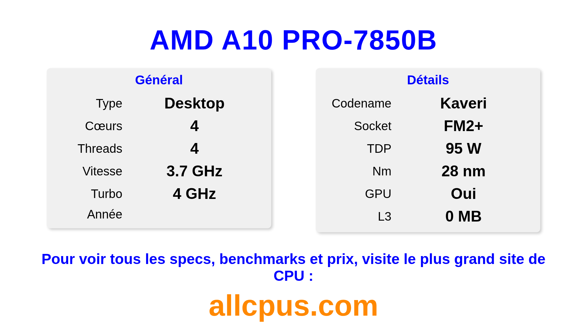 Le AMD A10 PRO-7850B est un AMD processeur de bureau de la gamme PRO A-Series, basé sur l’architecture Kaveri et sorti en . Ce CPU dispose de 4 cœurs, une fréquence de base de 3700 MHz, fréquence turbo max de 4000 MHz et 0 Mo de cache L3. Fabriqué avec la technologie 28 nm. Le AMD A10 PRO-7850B est conçu pour le socket FM2+. Il inclut les graphiques intégrés AMD Radeon R7 Graphics.