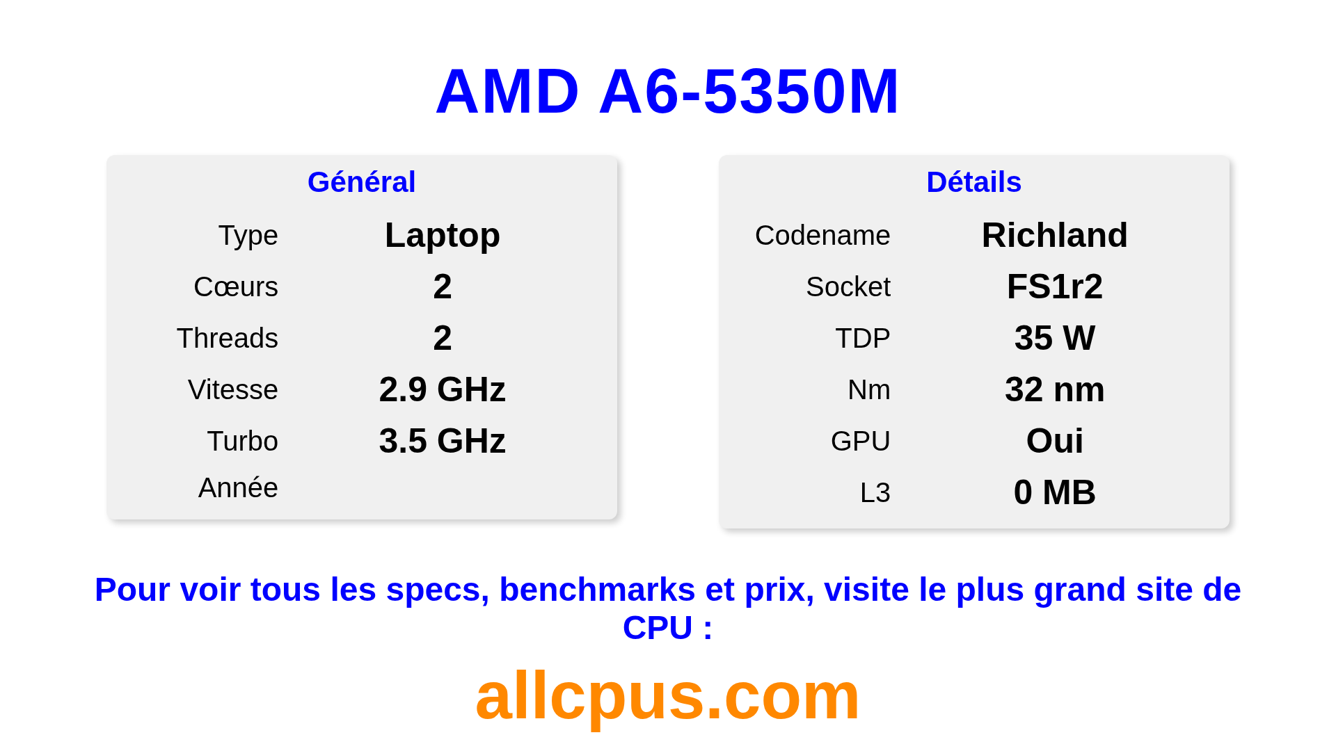 Le AMD A6-5350M est un AMD processeur portable de la gamme A-Series, basé sur l’architecture Richland et sorti en . Ce CPU dispose de 2 cœurs, une fréquence de base de 2900 MHz, fréquence turbo max de 3500 MHz et 0 Mo de cache L3. Fabriqué avec la technologie 32 nm. Le AMD A6-5350M est conçu pour le socket FS1r2. Il inclut les graphiques intégrés AMD Radeon HD 8450G.