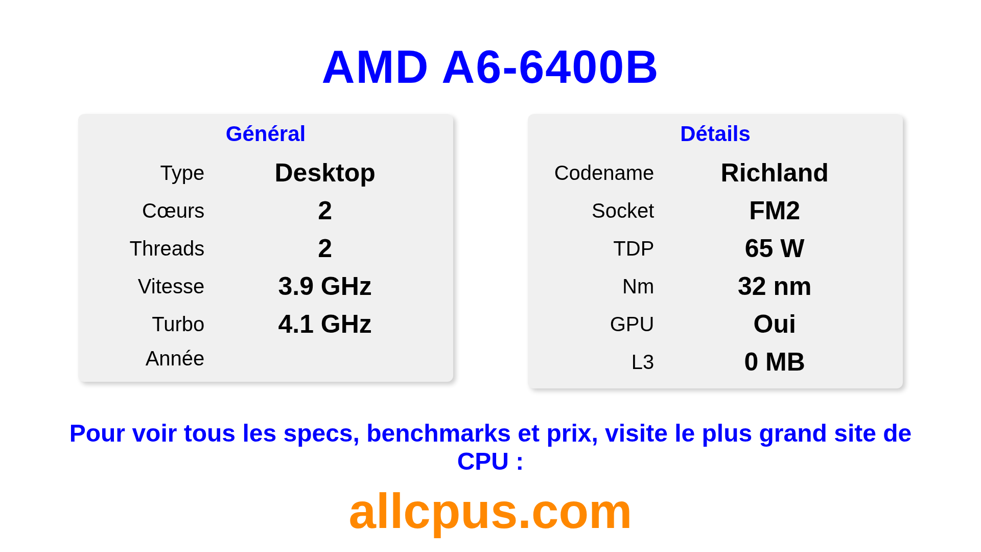 Le AMD A6-6400B est un AMD processeur de bureau de la gamme A-Series, basé sur l’architecture Richland et sorti en . Ce CPU dispose de 2 cœurs, une fréquence de base de 3900 MHz, fréquence turbo max de 4100 MHz et 0 Mo de cache L3. Fabriqué avec la technologie 32 nm. Le AMD A6-6400B est conçu pour le socket FM2. Il inclut les graphiques intégrés AMD Radeon HD 8470D.