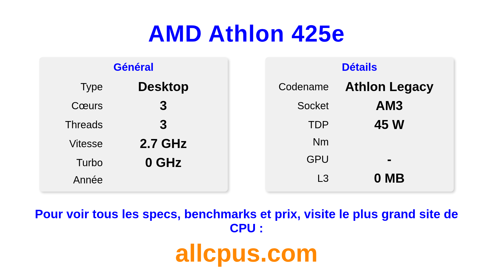 Le AMD Athlon 425e est un AMD processeur de bureau de la gamme Athlon, basé sur l’architecture Athlon Legacy et sorti en . Ce CPU dispose de 3 cœurs, une fréquence de base de 2700 MHz, fréquence turbo max de 0 MHz et 0 Mo de cache L3. Le AMD Athlon 425e est conçu pour le socket AM3. Une carte graphique dédiée est requise.