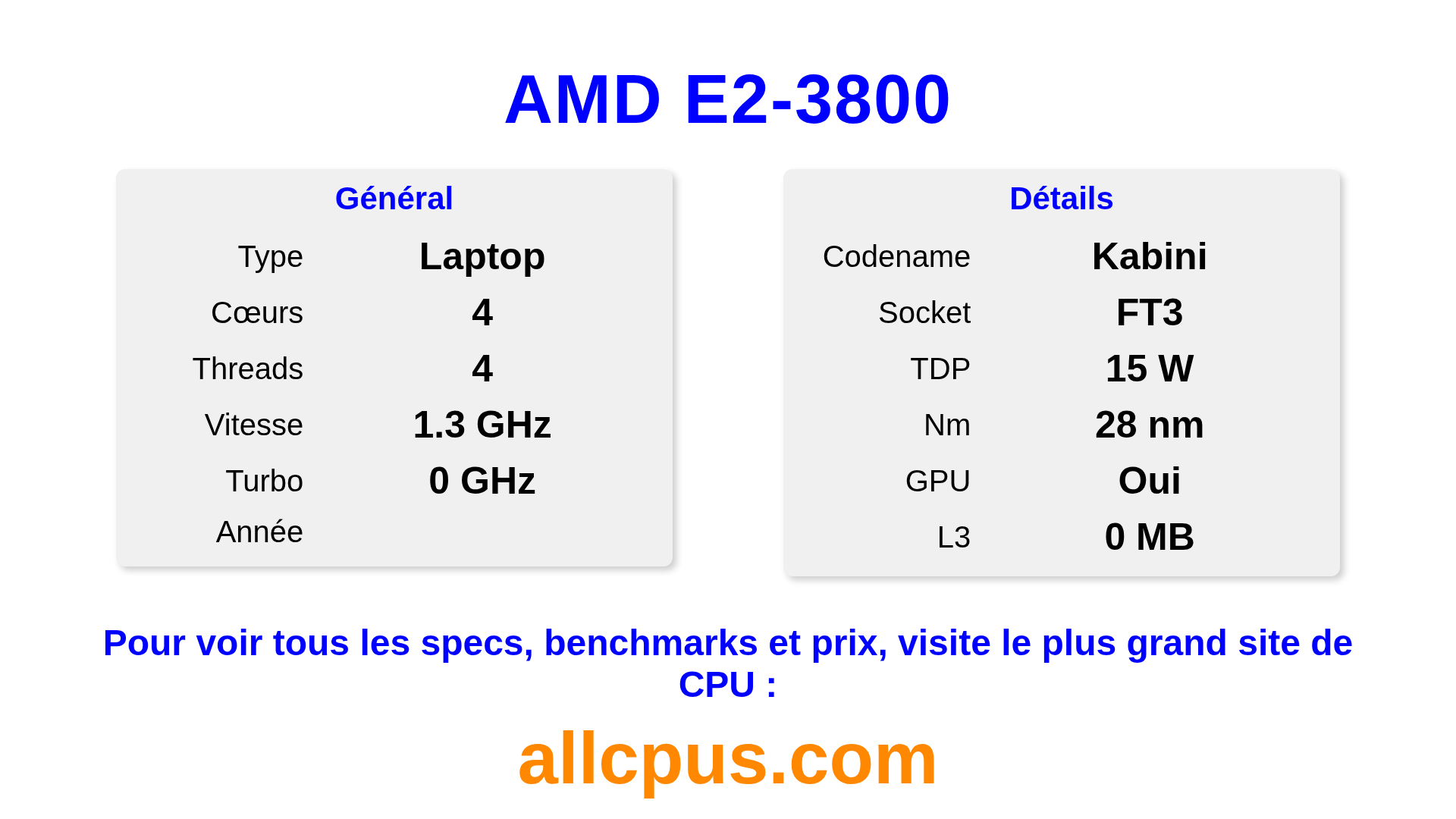 Le AMD E2-3800 est un AMD processeur portable de la gamme E-Series, basé sur l’architecture Kabini et sorti en . Ce CPU dispose de 4 cœurs, une fréquence de base de 1300 MHz, fréquence turbo max de 0 MHz et 0 Mo de cache L3. Fabriqué avec la technologie 28 nm. Le AMD E2-3800 est conçu pour le socket FT3. Il inclut les graphiques intégrés AMD Radeon HD 8280.