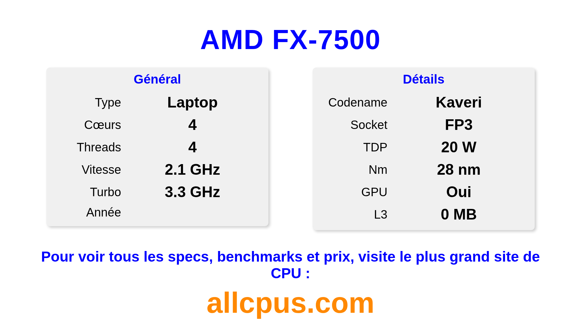 Le AMD FX-7500 est un AMD processeur portable de la gamme FX-Series, basé sur l’architecture Kaveri et sorti en . Ce CPU dispose de 4 cœurs, une fréquence de base de 2100 MHz, fréquence turbo max de 3300 MHz et 0 Mo de cache L3. Fabriqué avec la technologie 28 nm. Le AMD FX-7500 est conçu pour le socket FP3. Il inclut les graphiques intégrés AMD Radeon R7 Graphics.