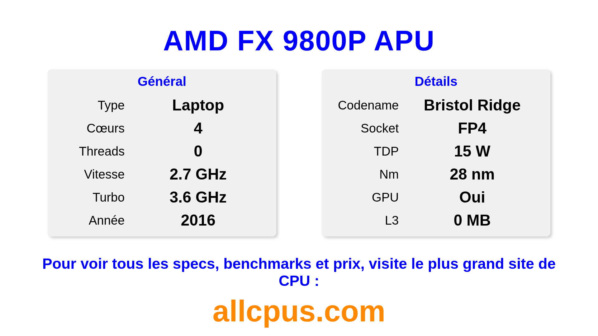 Le AMD FX 9800P APU est un AMD processeur portable de la gamme FX-Series, basé sur l’architecture Bristol Ridge et sorti en 2016. Ce CPU dispose de 4 cœurs, une fréquence de base de 2700 MHz, fréquence turbo max de 3600 MHz et 0 Mo de cache L3. Fabriqué avec la technologie 28 nm. Le AMD FX 9800P APU est conçu pour le socket FP4. Il inclut les graphiques intégrés AMD Radeon R7 Graphics.