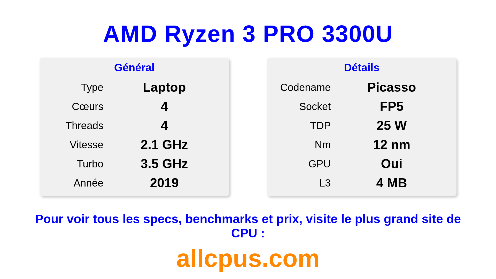 Le AMD Ryzen 3 PRO 3300U est un AMD processeur portable de la gamme Ryzen PRO, basé sur l’architecture Picasso et sorti en 2019. Ce CPU dispose de 4 cœurs, une fréquence de base de 2100 MHz, fréquence turbo max de 3500 MHz et 4 Mo de cache L3. Fabriqué avec la technologie 12 nm. Le AMD Ryzen 3 PRO 3300U est conçu pour le socket FP5. Il inclut les graphiques intégrés Radeon Vega 6 Graphics.