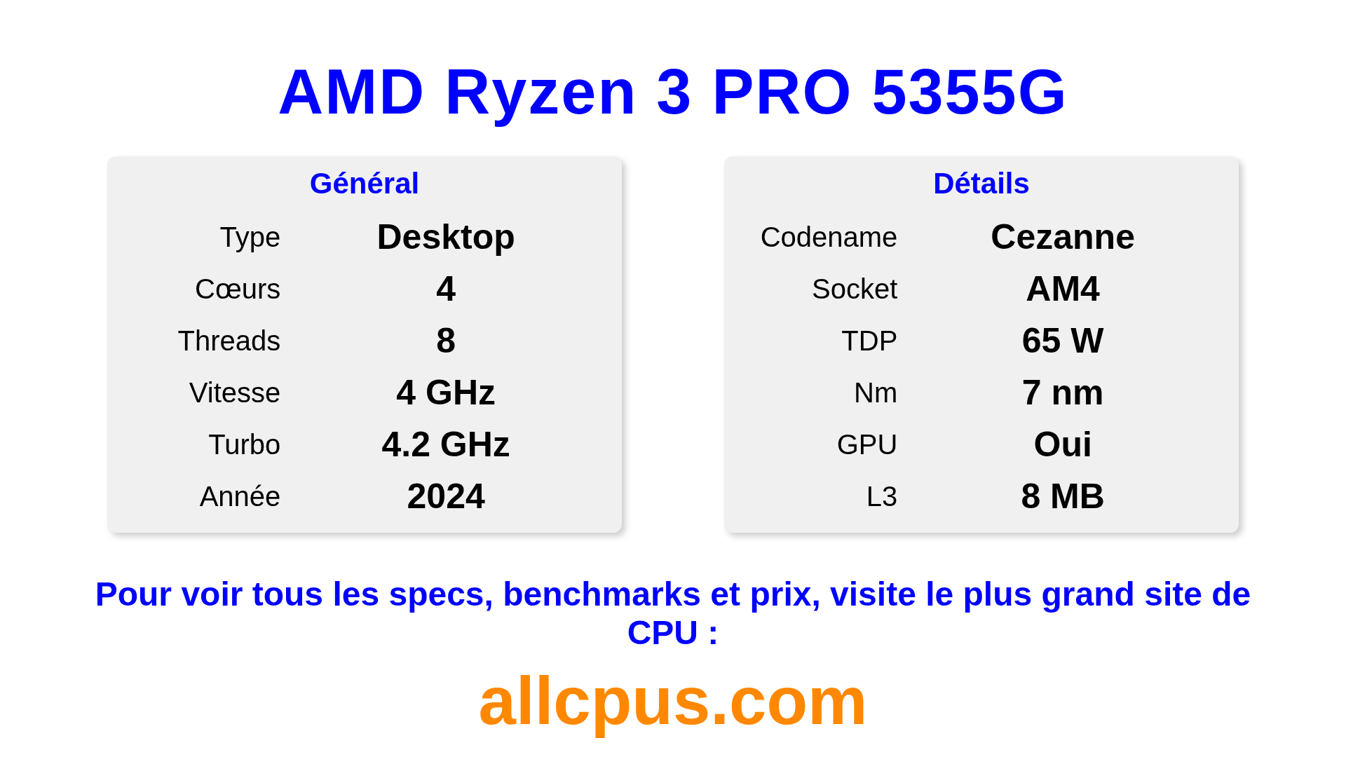 Le AMD Ryzen 3 PRO 5355G est un AMD processeur de bureau de la gamme Ryzen PRO, basé sur l’architecture Cezanne et sorti en 2024. Ce CPU dispose de 4 cœurs, une fréquence de base de 4000 MHz, fréquence turbo max de 4200 MHz et 8 Mo de cache L3. Fabriqué avec la technologie 7 nm. Le AMD Ryzen 3 PRO 5355G est conçu pour le socket AM4. Il inclut les graphiques intégrés Radeon Graphics.