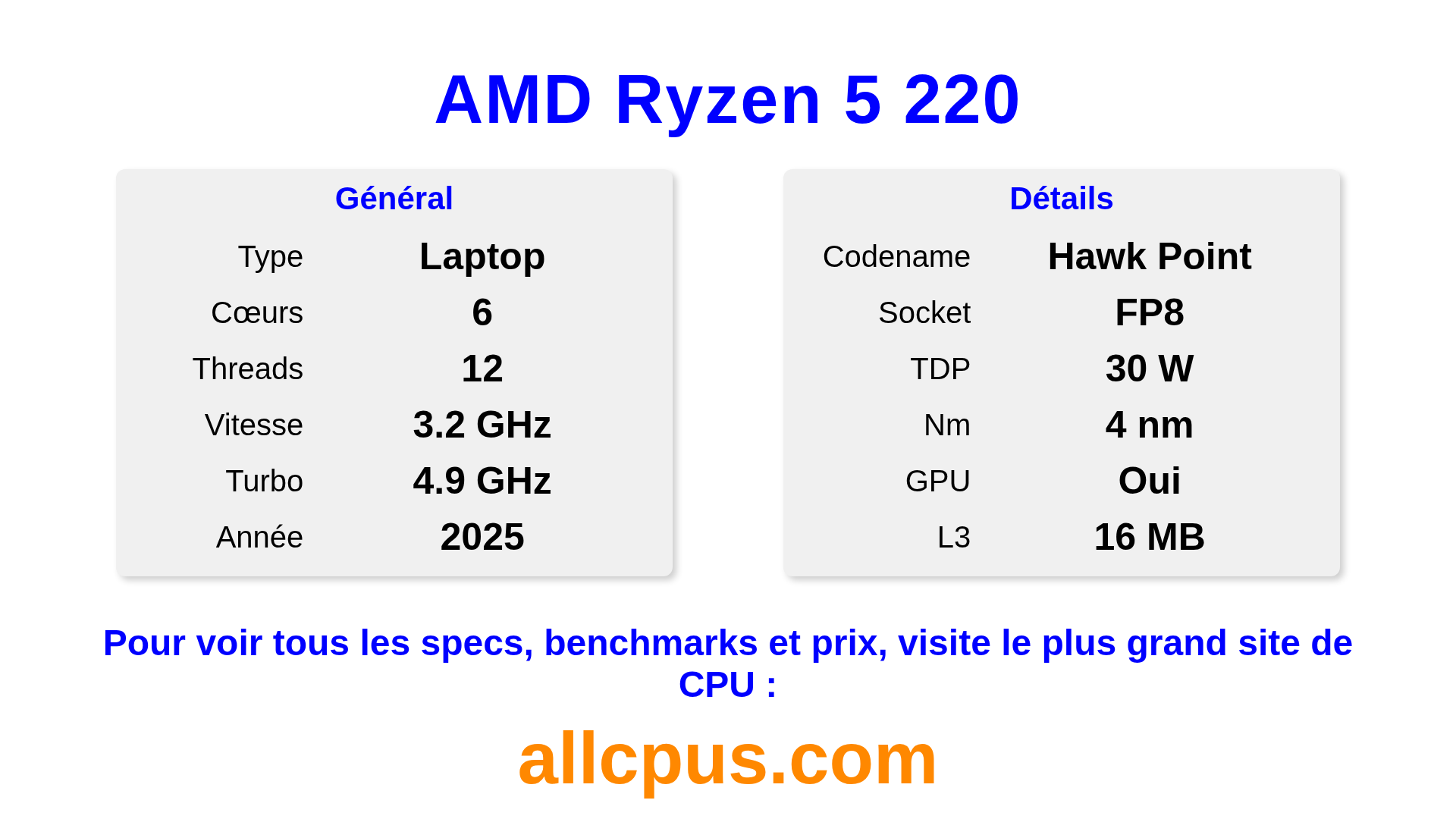 Le AMD Ryzen 5 220 est un AMD processeur portable de la gamme Ryzen, basé sur l’architecture Hawk Point et sorti en 2025. Ce CPU dispose de 6 cœurs, une fréquence de base de 3200 MHz, fréquence turbo max de 4900 MHz et 16 Mo de cache L3. Fabriqué avec la technologie 4 nm. Le AMD Ryzen 5 220 est conçu pour le socket FP8. Il inclut les graphiques intégrés AMD Radeon 740M.