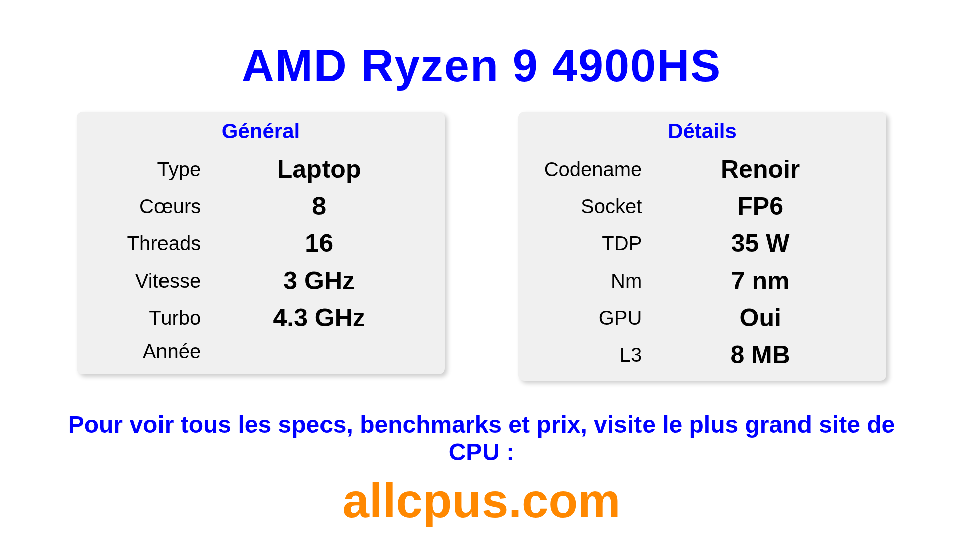 Le AMD Ryzen 9 4900HS est un AMD processeur portable de la gamme Ryzen, basé sur l’architecture Renoir et sorti en . Ce CPU dispose de 8 cœurs, une fréquence de base de 3000 MHz, fréquence turbo max de 4300 MHz et 8 Mo de cache L3. Fabriqué avec la technologie 7 nm. Le AMD Ryzen 9 4900HS est conçu pour le socket FP6. Il inclut les graphiques intégrés AMD Radeon Graphics.