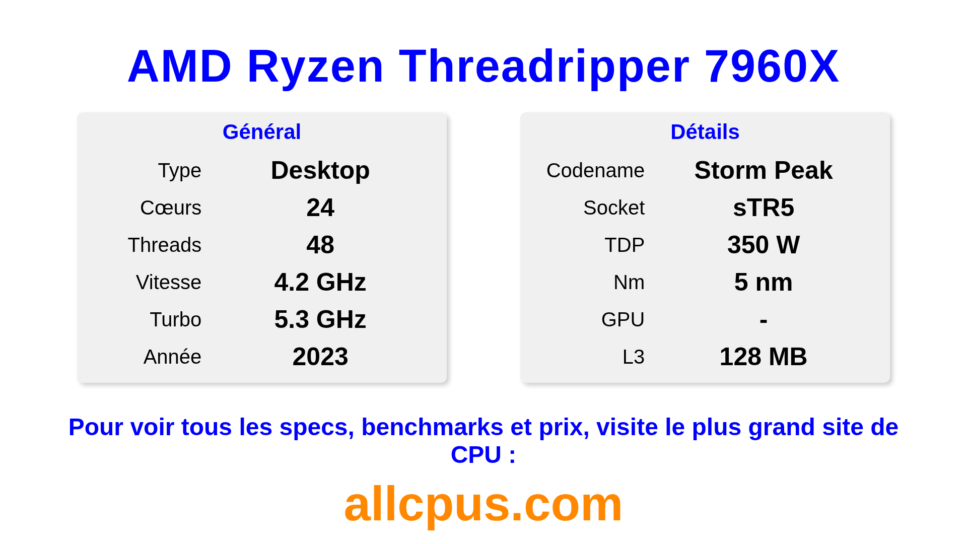 Le AMD Ryzen Threadripper 7960X est un AMD processeur de bureau de la gamme Ryzen Threadripper, basé sur l’architecture Storm Peak et sorti en 2023. Ce CPU dispose de 24 cœurs, une fréquence de base de 4200 MHz, fréquence turbo max de 5300 MHz et 128 Mo de cache L3. Fabriqué avec la technologie 5 nm. Le AMD Ryzen Threadripper 7960X est conçu pour le socket sTR5.Il supporte l’overclocking. Une carte graphique dédiée est requise.