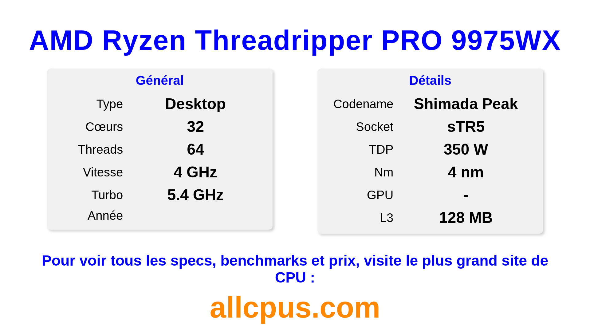 Le AMD Ryzen Threadripper PRO 9975WX est un AMD processeur de bureau de la gamme Ryzen Threadripper PRO, basé sur l’architecture Shimada Peak et sorti en . Ce CPU dispose de 32 cœurs, une fréquence de base de 4000 MHz, fréquence turbo max de 5400 MHz et 128 Mo de cache L3. Fabriqué avec la technologie 4 nm. Le AMD Ryzen Threadripper PRO 9975WX est conçu pour le socket sTR5.Il supporte l’overclocking. Une carte graphique dédiée est requise.