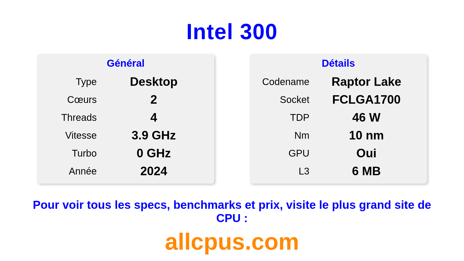 Le Intel 300 est un Intel processeur de bureau de la gamme Intel Processor, basé sur l’architecture Raptor Lake et sorti en 2024. Ce CPU dispose de 2 cœurs, une fréquence de base de 3900 MHz, fréquence turbo max de 0 MHz et 6 Mo de cache L3. Fabriqué avec la technologie 10 nm. Le Intel 300 est conçu pour le socket LGA1700. Il inclut les graphiques intégrés Intel® UHD Graphics 710.