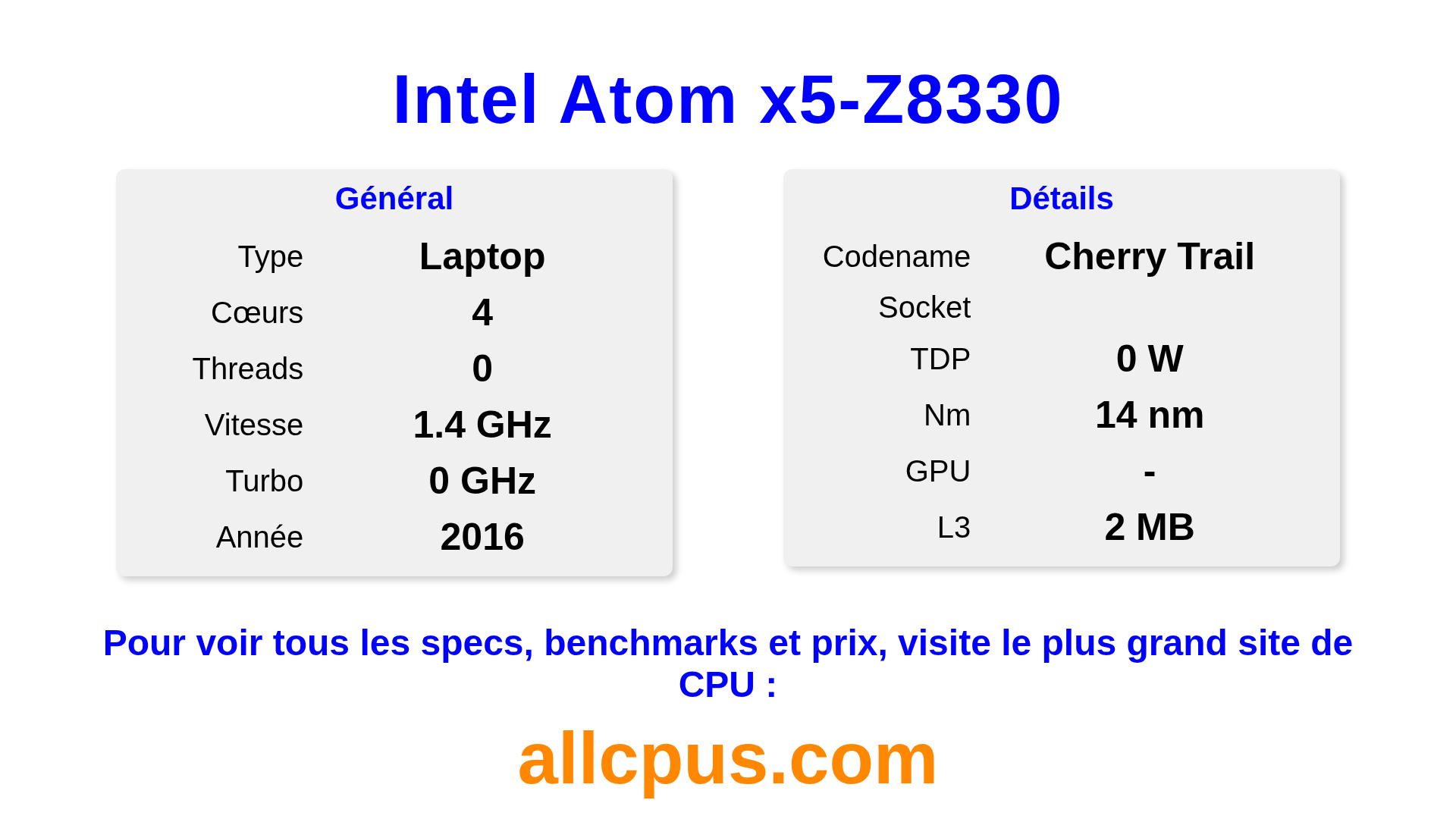 Le Intel Atom x5-Z8330 est un Intel processeur portable de la gamme Intel Atom Processor Family, basé sur l’architecture Cherry Trail et sorti en 2016. Ce CPU dispose de 4 cœurs, une fréquence de base de 1440 MHz, fréquence turbo max de 0 MHz et 2 Mo de cache L3. Fabriqué avec la technologie 14 nm. Le Intel Atom x5-Z8330 est conçu pour le socket . Une carte graphique dédiée est requise.