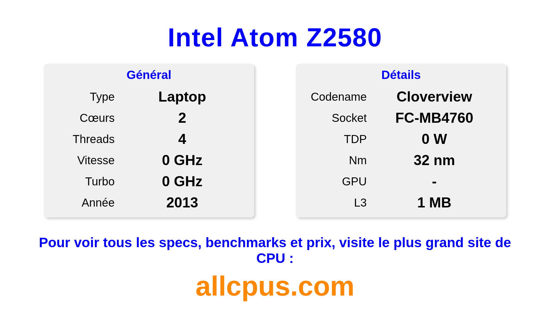 Le Intel Atom Z2580 est un Intel processeur portable de la gamme Intel Atom Processor Family, basé sur l’architecture Cloverview et sorti en 2013. Ce CPU dispose de 2 cœurs, une fréquence de base de 0 MHz, fréquence turbo max de 0 MHz et 1 Mo de cache L3. Fabriqué avec la technologie 32 nm. Le Intel Atom Z2580 est conçu pour le socket -MB4760. Une carte graphique dédiée est requise.