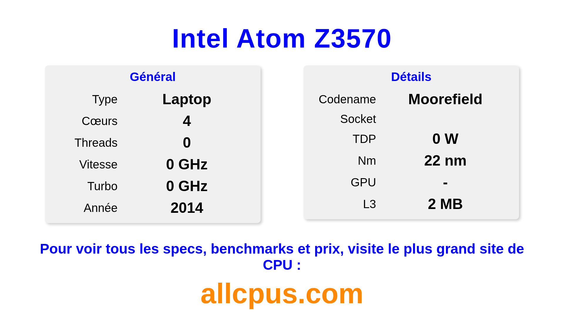 Le Intel Atom Z3570 est un Intel processeur portable de la gamme Intel Atom Processor Family, basé sur l’architecture Moorefield et sorti en 2014. Ce CPU dispose de 4 cœurs, une fréquence de base de 0 MHz, fréquence turbo max de 0 MHz et 2 Mo de cache L3. Fabriqué avec la technologie 22 nm. Le Intel Atom Z3570 est conçu pour le socket . Une carte graphique dédiée est requise.