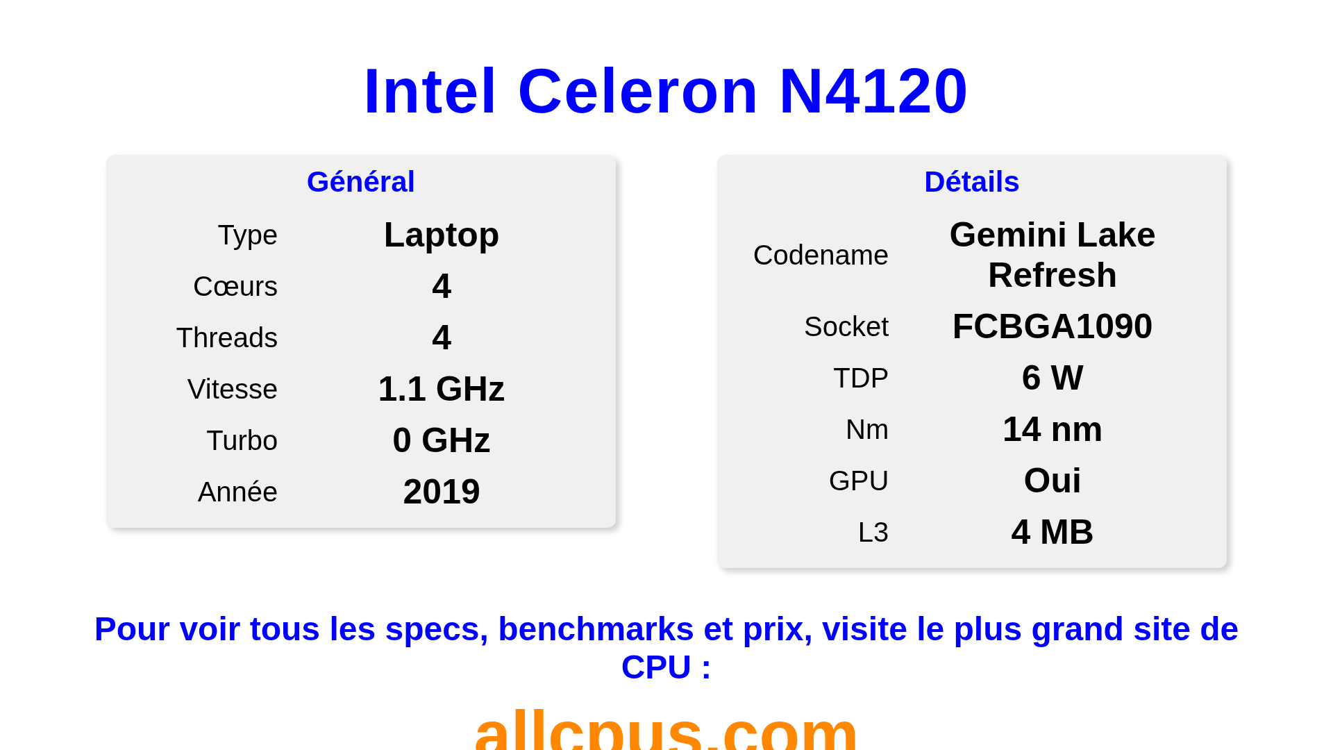 Le Intel Celeron N4120 est un Intel processeur portable de la gamme Intel® Celeron®, basé sur l’architecture Gemini Lake Refresh et sorti en 2019. Ce CPU dispose de 4 cœurs, une fréquence de base de 1100 MHz, fréquence turbo max de 0 MHz et 4 Mo de cache L3. Fabriqué avec la technologie 14 nm. Le Intel Celeron N4120 est conçu pour le socket BGA1090. Il inclut les graphiques intégrés Intel® UHD Graphics 600.