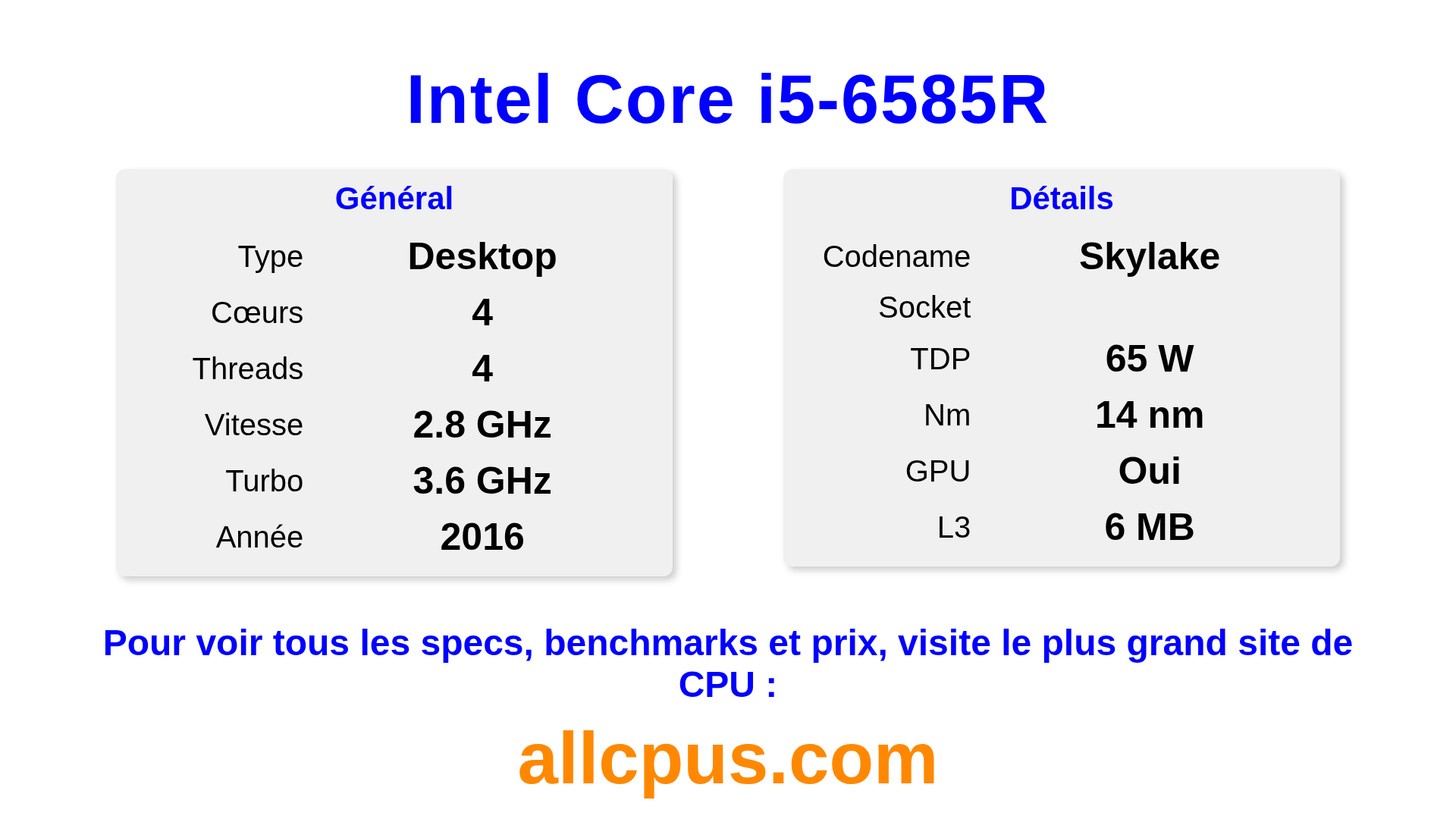 Le Intel Core i5-6585R est un Intel processeur de bureau de la gamme Intel Core, basé sur l’architecture Skylake et sorti en 2016. Ce CPU dispose de 4 cœurs, une fréquence de base de 2800 MHz, fréquence turbo max de 3600 MHz et 6 Mo de cache L3. Fabriqué avec la technologie 14 nm. Le Intel Core i5-6585R est conçu pour le socket . Il inclut les graphiques intégrés Intel® Iris® Pro Graphics 580.