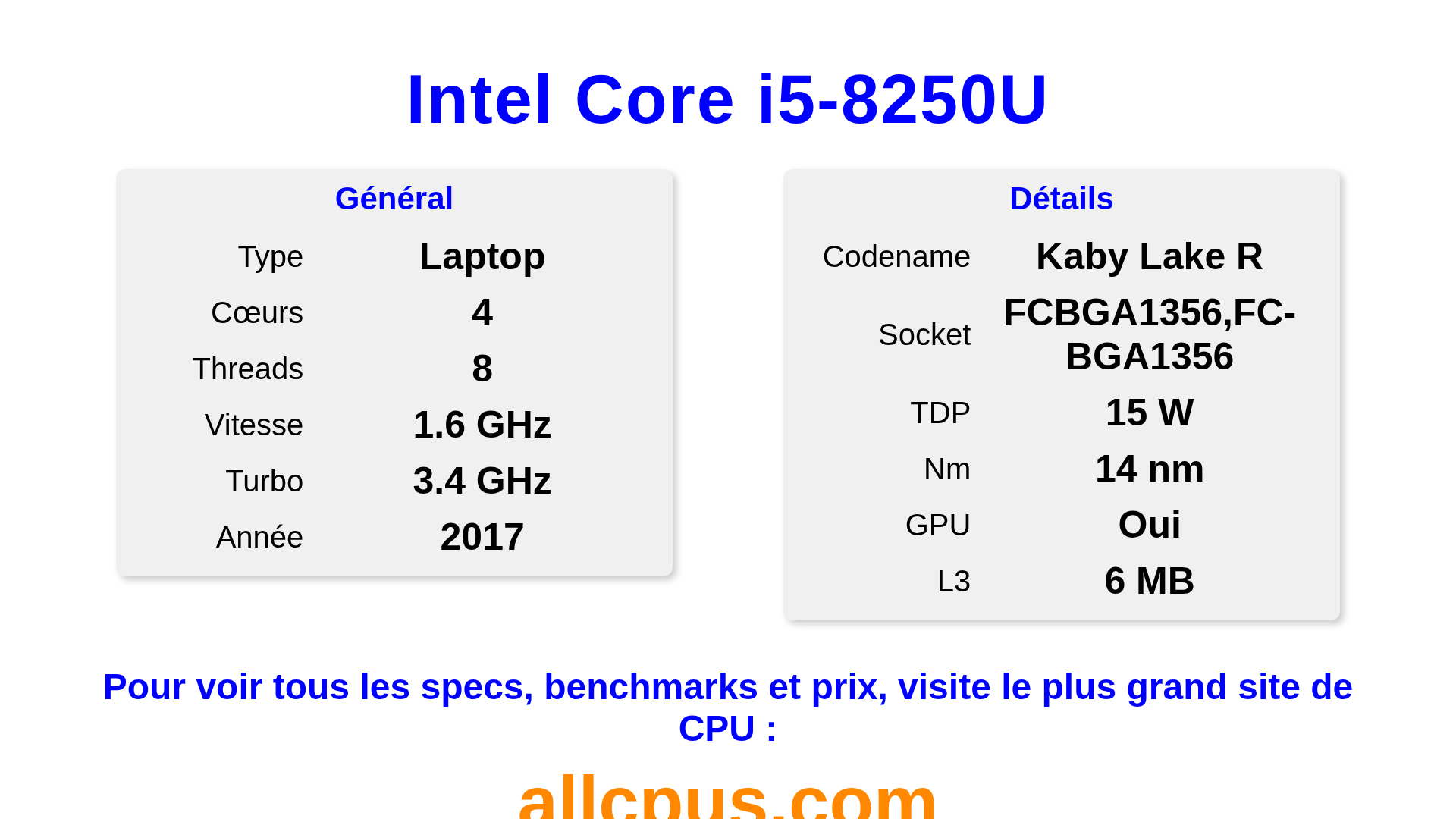 Le Intel Core i5-8250U est un Intel processeur portable de la gamme Intel Core, basé sur l’architecture Kaby Lake R et sorti en 2017. Ce CPU dispose de 4 cœurs, une fréquence de base de 1600 MHz, fréquence turbo max de 3400 MHz et 6 Mo de cache L3. Fabriqué avec la technologie 14 nm. Le Intel Core i5-8250U est conçu pour le socket BGA1356,FC-BGA1356. Il inclut les graphiques intégrés Intel® UHD Graphics 620.