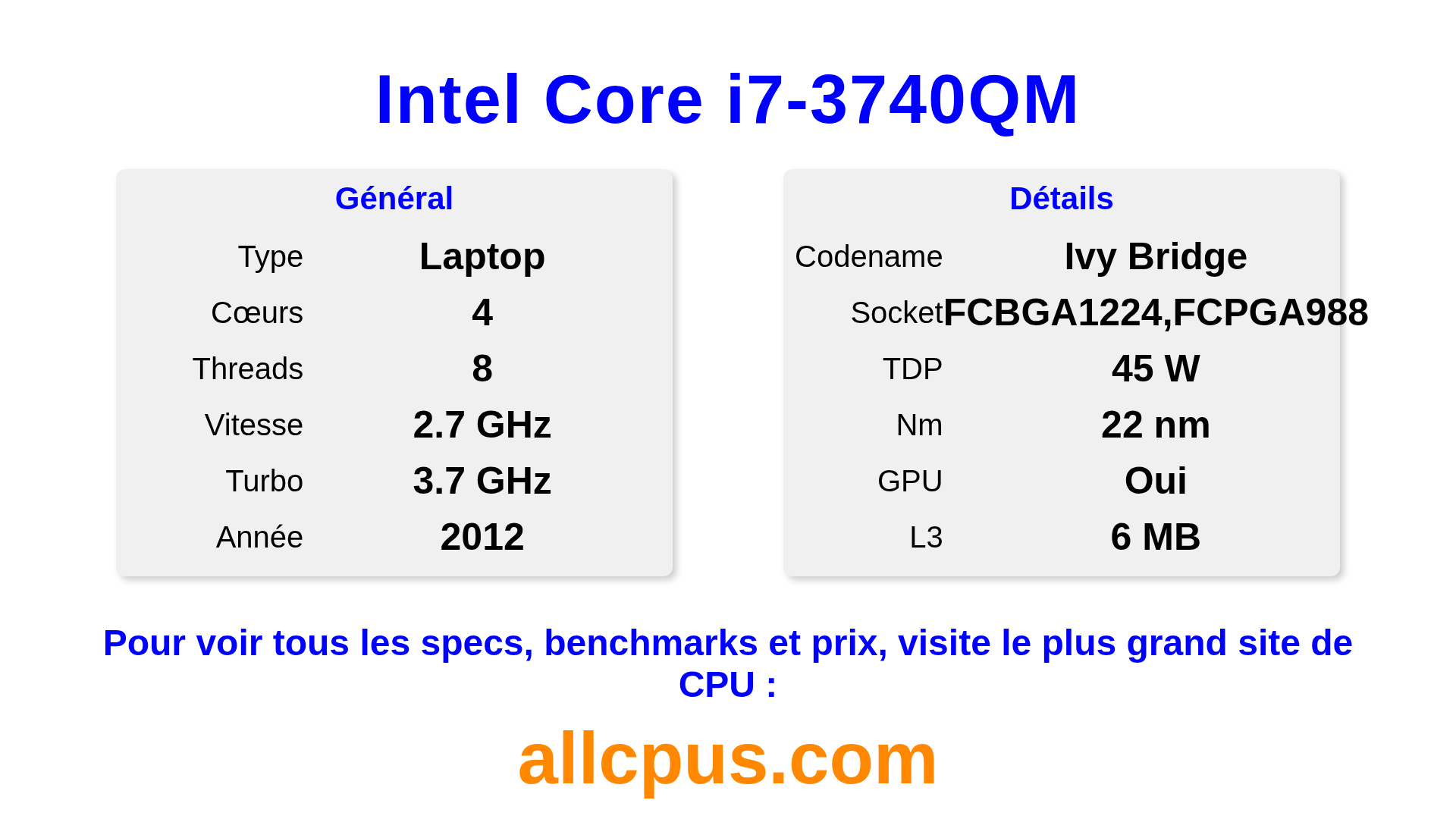 Intel Core i7-3740QM is better than 25% cpus with score 42Dans ce graphique, vous pouvez voir pour quelles tâches ce CPU est performant. Les scores sont Blender Benchmark Scores Le score Blender représente la performance multi-cœur totale du processeur sous charge lourde soutenue. Il reflète bien la puissance totale du processeur..
