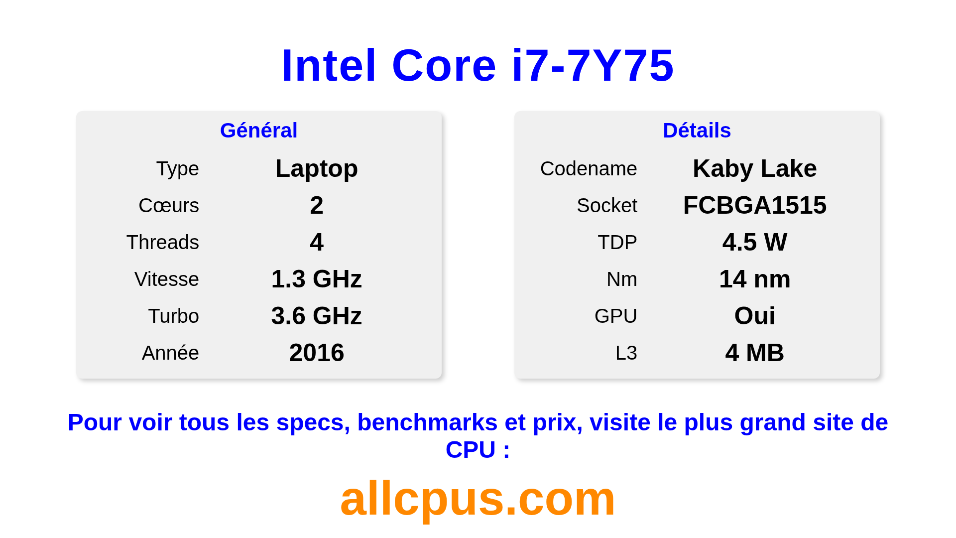 Le Intel Core i7-7Y75 est un Intel processeur portable de la gamme Intel Core, basé sur l’architecture Kaby Lake et sorti en 2016. Ce CPU dispose de 2 cœurs, une fréquence de base de 1300 MHz, fréquence turbo max de 3600 MHz et 4 Mo de cache L3. Fabriqué avec la technologie 14 nm. Le Intel Core i7-7Y75 est conçu pour le socket BGA1515. Il inclut les graphiques intégrés Intel® HD Graphics 615.