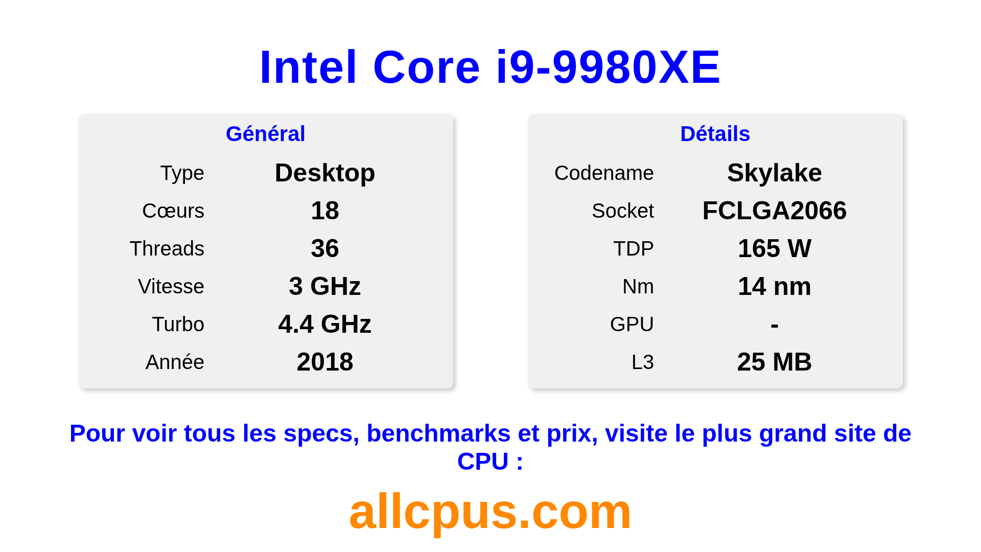 Le Intel Core i9-9980XE est un Intel processeur de bureau de la gamme Intel Core, basé sur l’architecture Skylake et sorti en 2018. Ce CPU dispose de 18 cœurs, une fréquence de base de 3000 MHz, fréquence turbo max de 4400 MHz et 25 Mo de cache L3. Fabriqué avec la technologie 14 nm. Le Intel Core i9-9980XE est conçu pour le socket LGA2066. Une carte graphique dédiée est requise.
