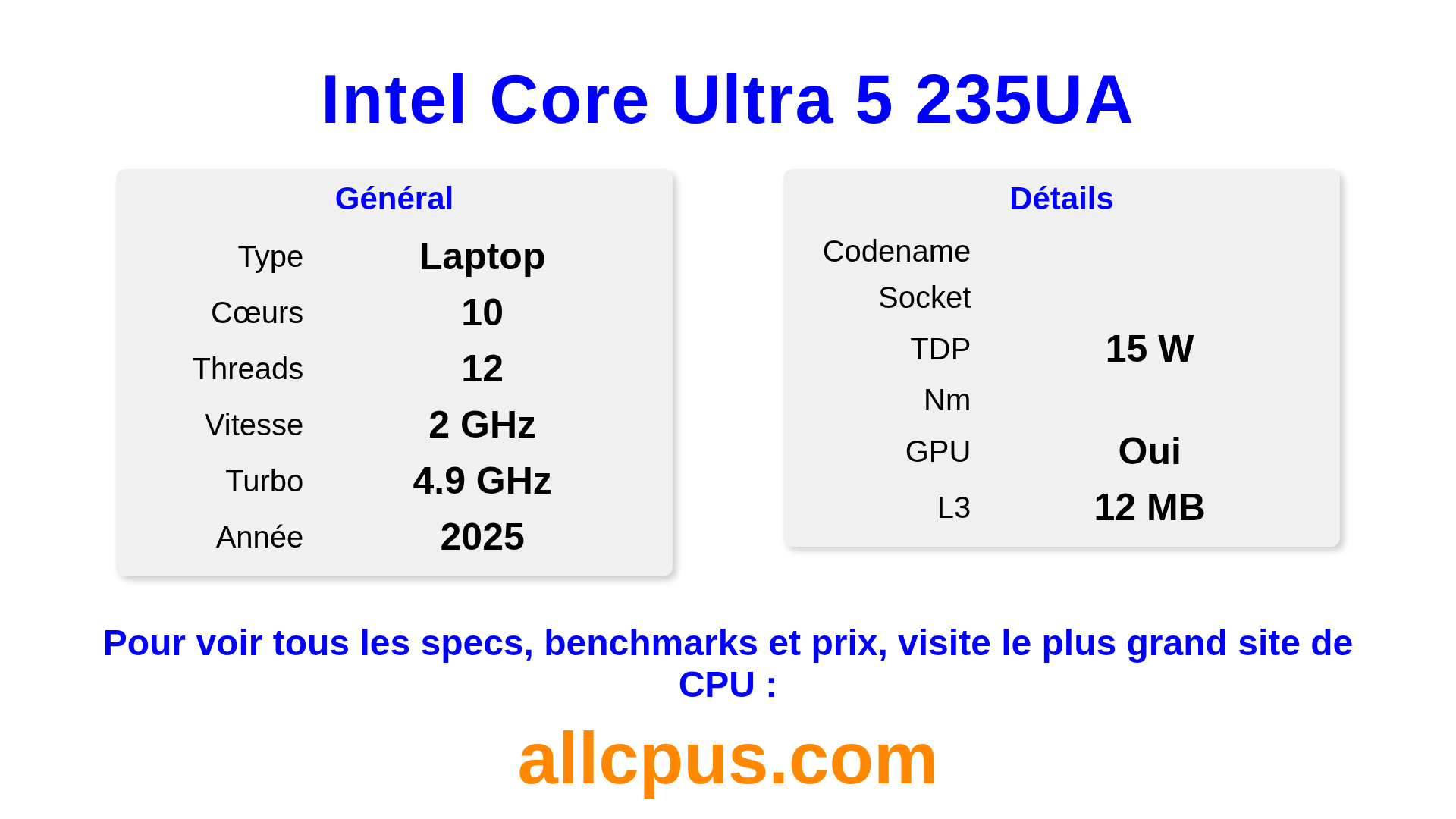 Le Intel Core Ultra 5 235UA est un Intel processeur portable de la gamme Intel Core Ultra, basé sur l’architecture et sorti en 2025. Ce CPU dispose de 10 cœurs, une fréquence de base de 2000 MHz, fréquence turbo max de 4900 MHz et 12 Mo de cache L3. Le Intel Core Ultra 5 235UA est conçu pour le socket . Il inclut les graphiques intégrés Intel® Graphics.