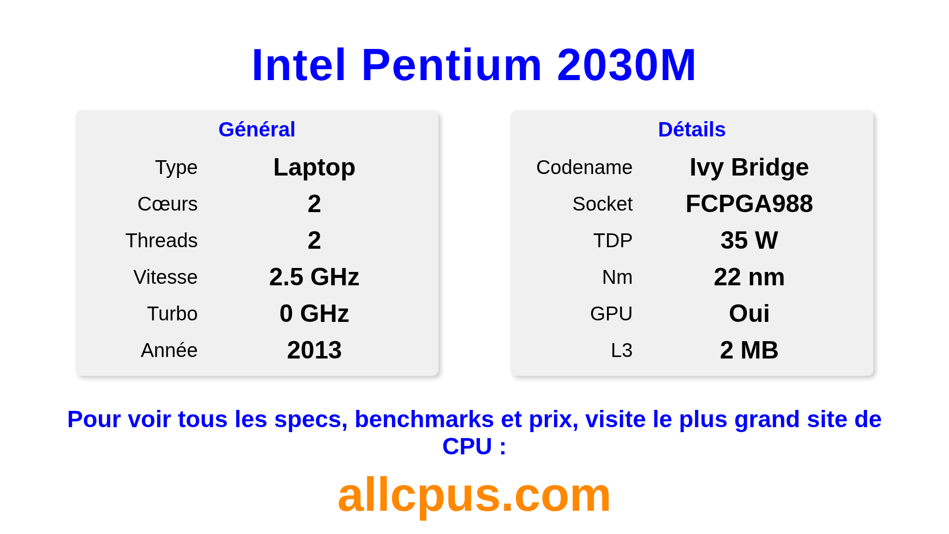 Le Intel Pentium 2030M est un Intel processeur portable de la gamme Intel® Pentium®, basé sur l’architecture Ivy Bridge et sorti en 2013. Ce CPU dispose de 2 cœurs, une fréquence de base de 2500 MHz, fréquence turbo max de 0 MHz et 2 Mo de cache L3. Fabriqué avec la technologie 22 nm. Le Intel Pentium 2030M est conçu pour le socket PGA988. Il inclut les graphiques intégrés Intel® HD Graphics for 3rd Generation Intel® Processors.