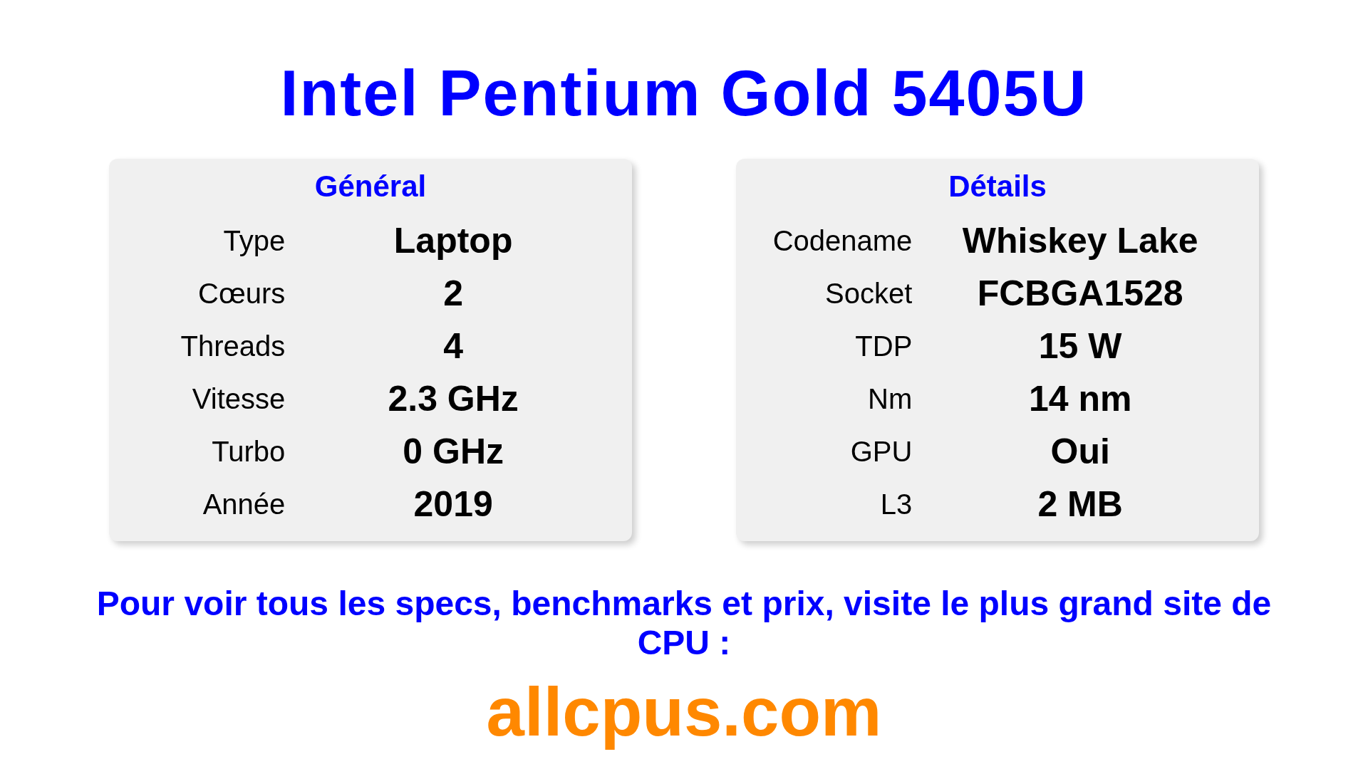 Le Intel Pentium Gold 5405U est un Intel processeur portable de la gamme Intel® Pentium® Gold, basé sur l’architecture Whiskey Lake et sorti en 2019. Ce CPU dispose de 2 cœurs, une fréquence de base de 2300 MHz, fréquence turbo max de 0 MHz et 2 Mo de cache L3. Fabriqué avec la technologie 14 nm. Le Intel Pentium Gold 5405U est conçu pour le socket BGA1528. Il inclut les graphiques intégrés Intel® UHD Graphics for 8th Generation Intel® Processors.