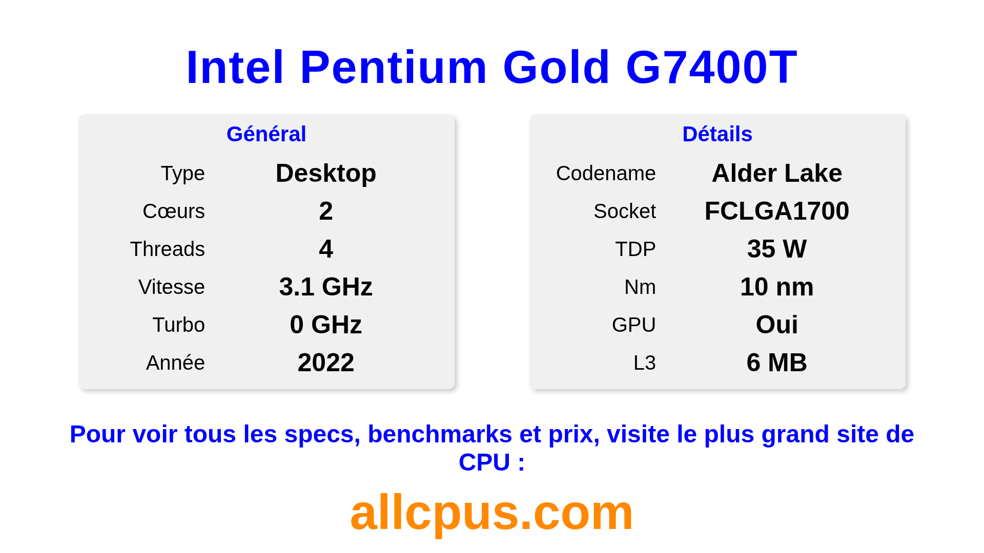 Le Intel Pentium Gold G7400T est un Intel processeur de bureau de la gamme Intel® Pentium® Gold, basé sur l’architecture Alder Lake et sorti en 2022. Ce CPU dispose de 2 cœurs, une fréquence de base de 3100 MHz, fréquence turbo max de 0 MHz et 6 Mo de cache L3. Fabriqué avec la technologie 10 nm. Le Intel Pentium Gold G7400T est conçu pour le socket LGA1700. Il inclut les graphiques intégrés Intel® UHD Graphics 710.