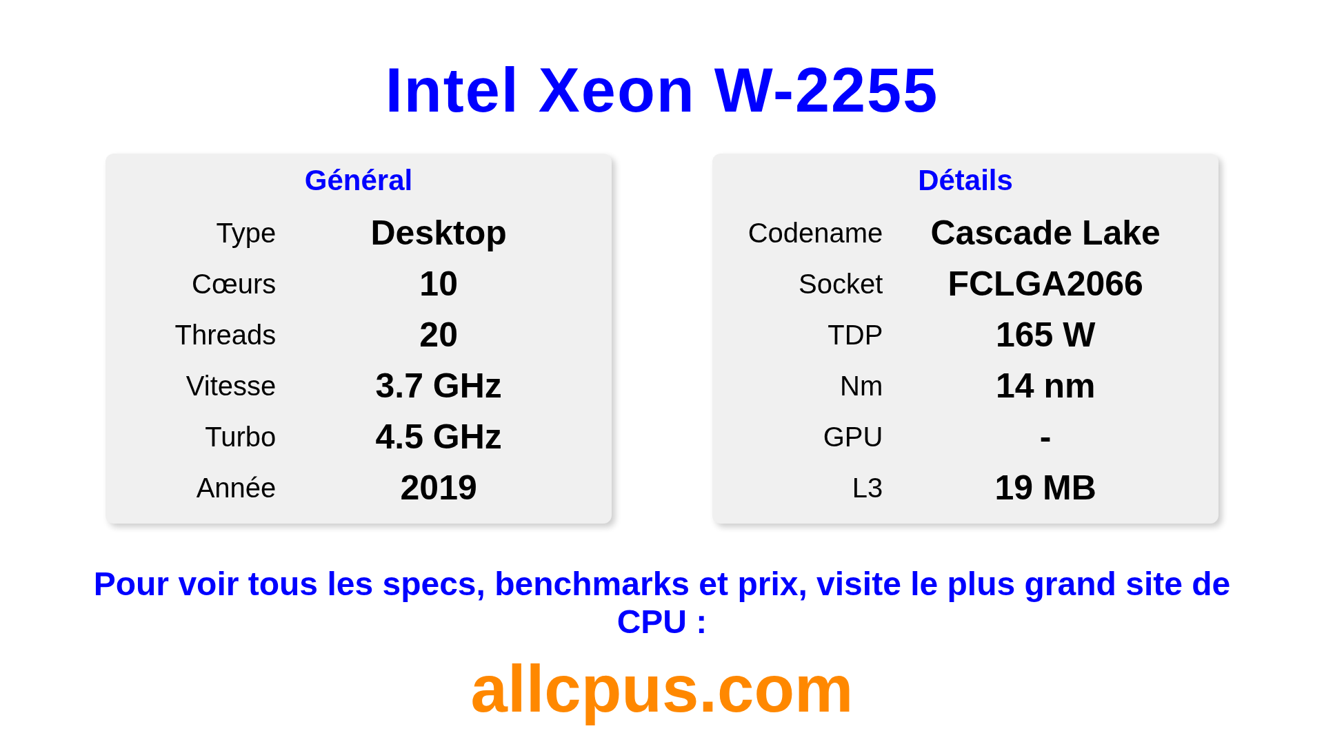 Intel Xeon W-2255 is better than 73% cpus with score 187Dans ce graphique, vous pouvez voir pour quelles tâches ce CPU est performant. Les scores sont Blender Benchmark Scores Le score Blender représente la performance multi-cœur totale du processeur sous charge lourde soutenue. Il reflète bien la puissance totale du processeur..