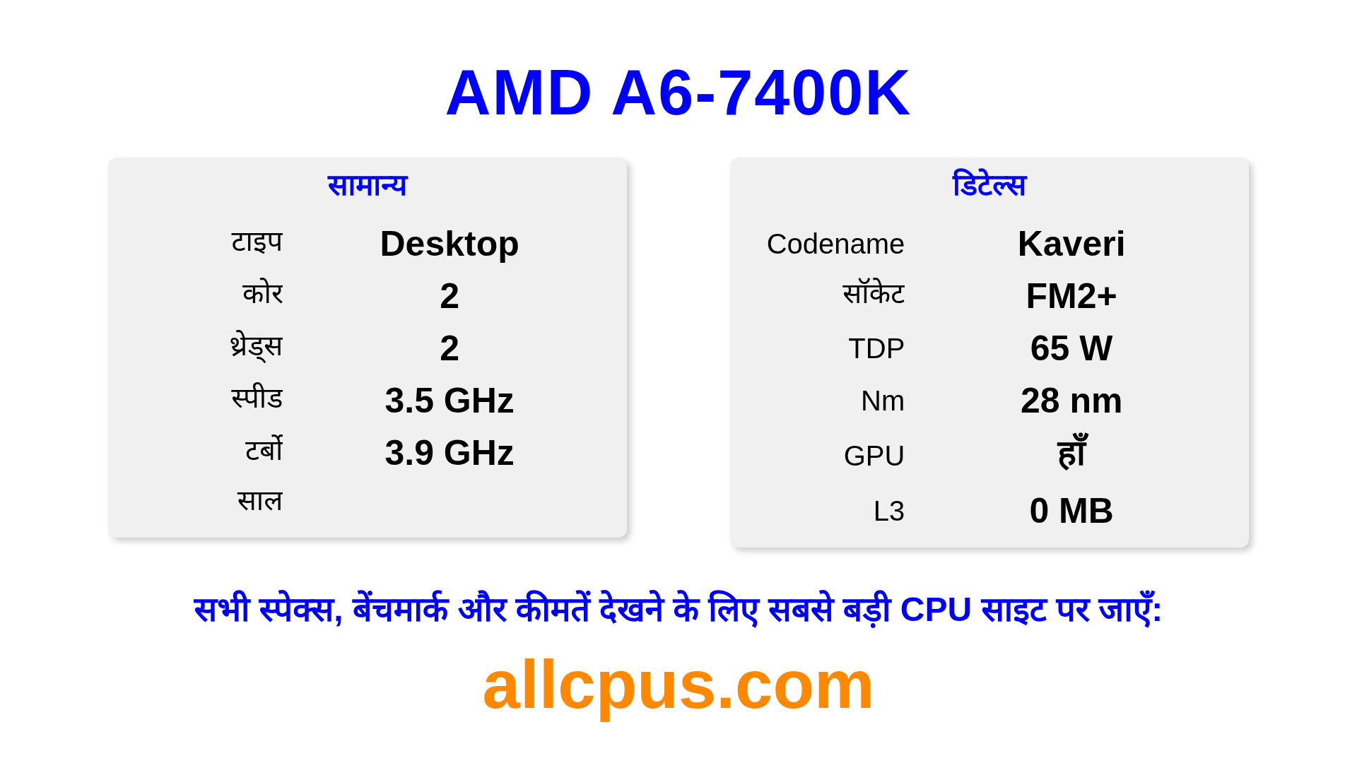 AMD A6-7400K A-Series लाइनअप का AMD डेस्कटॉप प्रोसेसर है, Kaveri आर्किटेक्चर पर आधारित और में जारी किया गया। इस CPU में 2 कोर, बेस क्लॉक 3500 MHz, अधिकतम टर्बो फ्रीक्वेंसी 3900 MHz और 0 MB L3 कैश है। 28 nm प्रोसेस टेक्नोलॉजी का उपयोग करके निर्मित। AMD A6-7400K FM2+ सॉकेट के लिए डिज़ाइन किया गया है।यह ओवरक्लॉकिंग को सपोर्ट करता है। इसमें इंटीग्रेटेड AMD Radeon R5 Graphics ग्राफिक्स शामिल है।