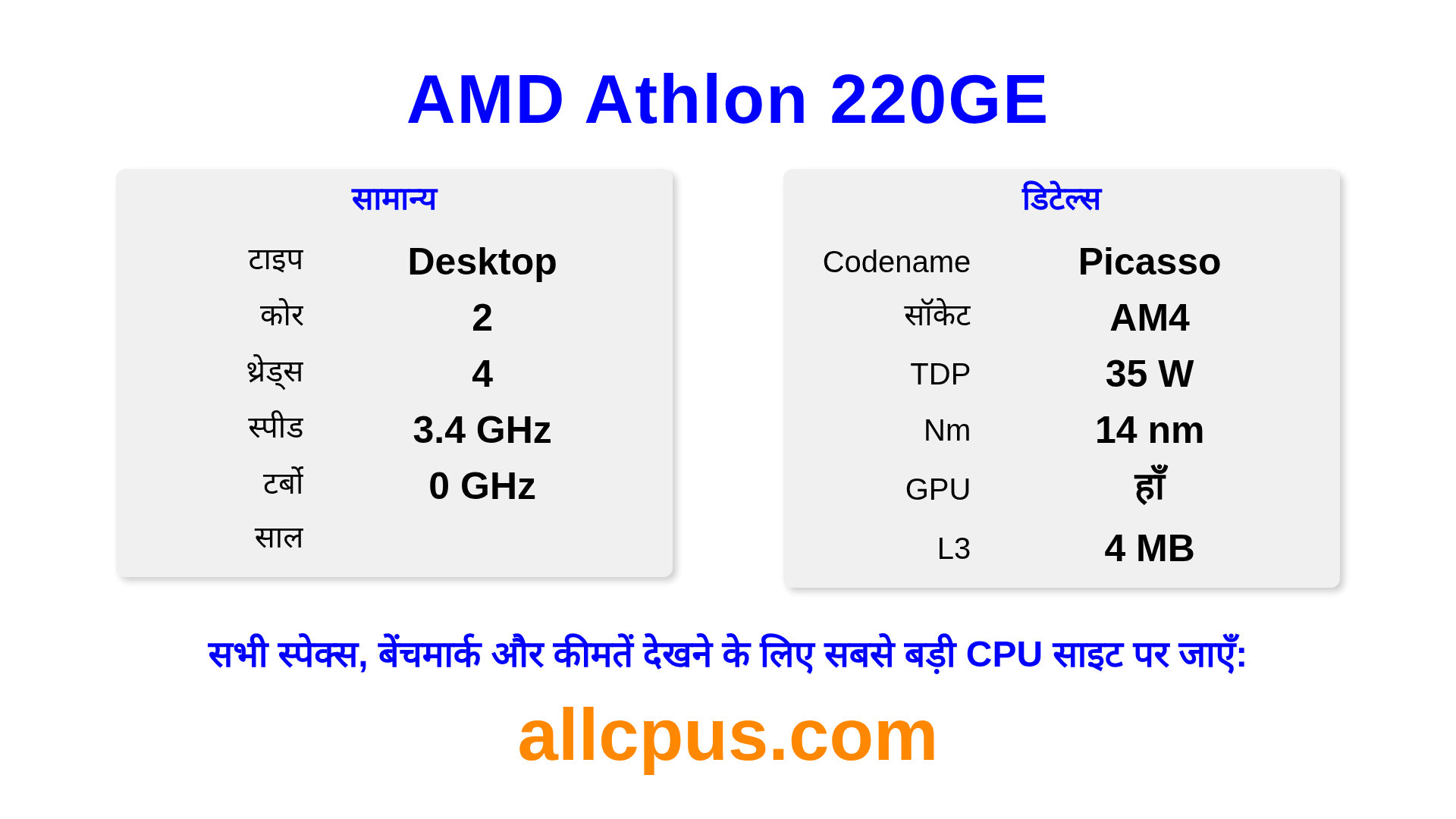 AMD Athlon 220GE Athlon लाइनअप का AMD डेस्कटॉप प्रोसेसर है, Picasso आर्किटेक्चर पर आधारित और में जारी किया गया। इस CPU में 2 कोर, बेस क्लॉक 3400 MHz, अधिकतम टर्बो फ्रीक्वेंसी 0 MHz और 4 MB L3 कैश है। 14 nm प्रोसेस टेक्नोलॉजी का उपयोग करके निर्मित। AMD Athlon 220GE AM4 सॉकेट के लिए डिज़ाइन किया गया है। इसमें इंटीग्रेटेड Radeon Vega 3 Graphics ग्राफिक्स शामिल है।