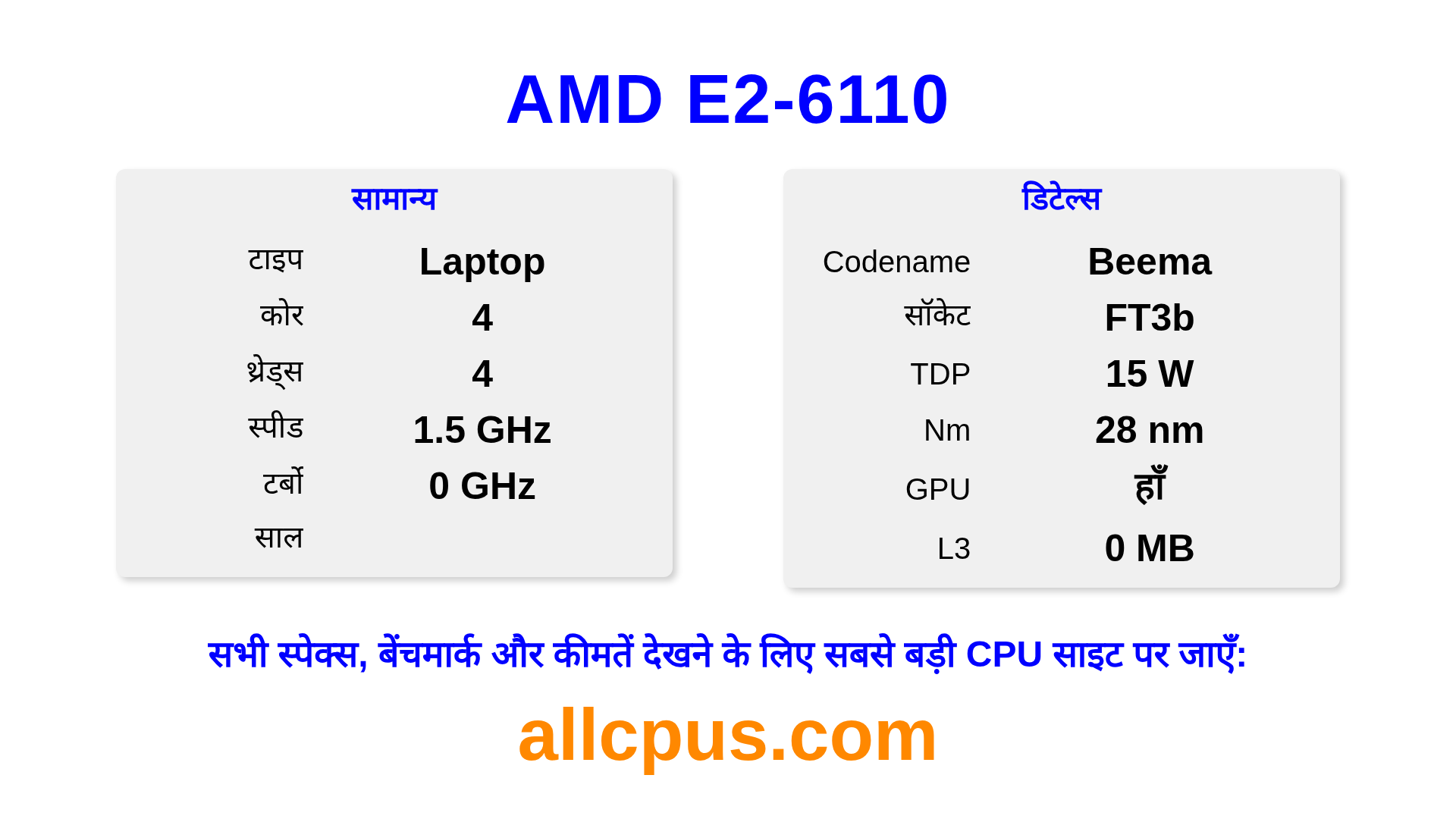 AMD E2-6110 E-Series लाइनअप का AMD लैपटॉप प्रोसेसर है, Beema आर्किटेक्चर पर आधारित और में जारी किया गया। इस CPU में 4 कोर, बेस क्लॉक 1500 MHz, अधिकतम टर्बो फ्रीक्वेंसी 0 MHz और 0 MB L3 कैश है। 28 nm प्रोसेस टेक्नोलॉजी का उपयोग करके निर्मित। AMD E2-6110 FT3b सॉकेट के लिए डिज़ाइन किया गया है। इसमें इंटीग्रेटेड AMD Radeon R2 Graphics ग्राफिक्स शामिल है।