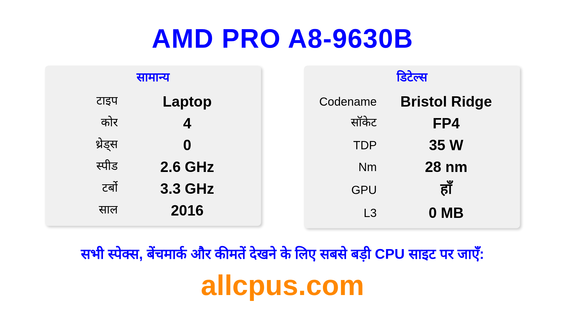 AMD PRO A8-9630B PRO A-Series लाइनअप का AMD लैपटॉप प्रोसेसर है, Bristol Ridge आर्किटेक्चर पर आधारित और 2016 में जारी किया गया। इस CPU में 4 कोर, बेस क्लॉक 2600 MHz, अधिकतम टर्बो फ्रीक्वेंसी 3300 MHz और 0 MB L3 कैश है। 28 nm प्रोसेस टेक्नोलॉजी का उपयोग करके निर्मित। AMD PRO A8-9630B FP4 सॉकेट के लिए डिज़ाइन किया गया है। इसमें इंटीग्रेटेड R5 ग्राफिक्स शामिल है।