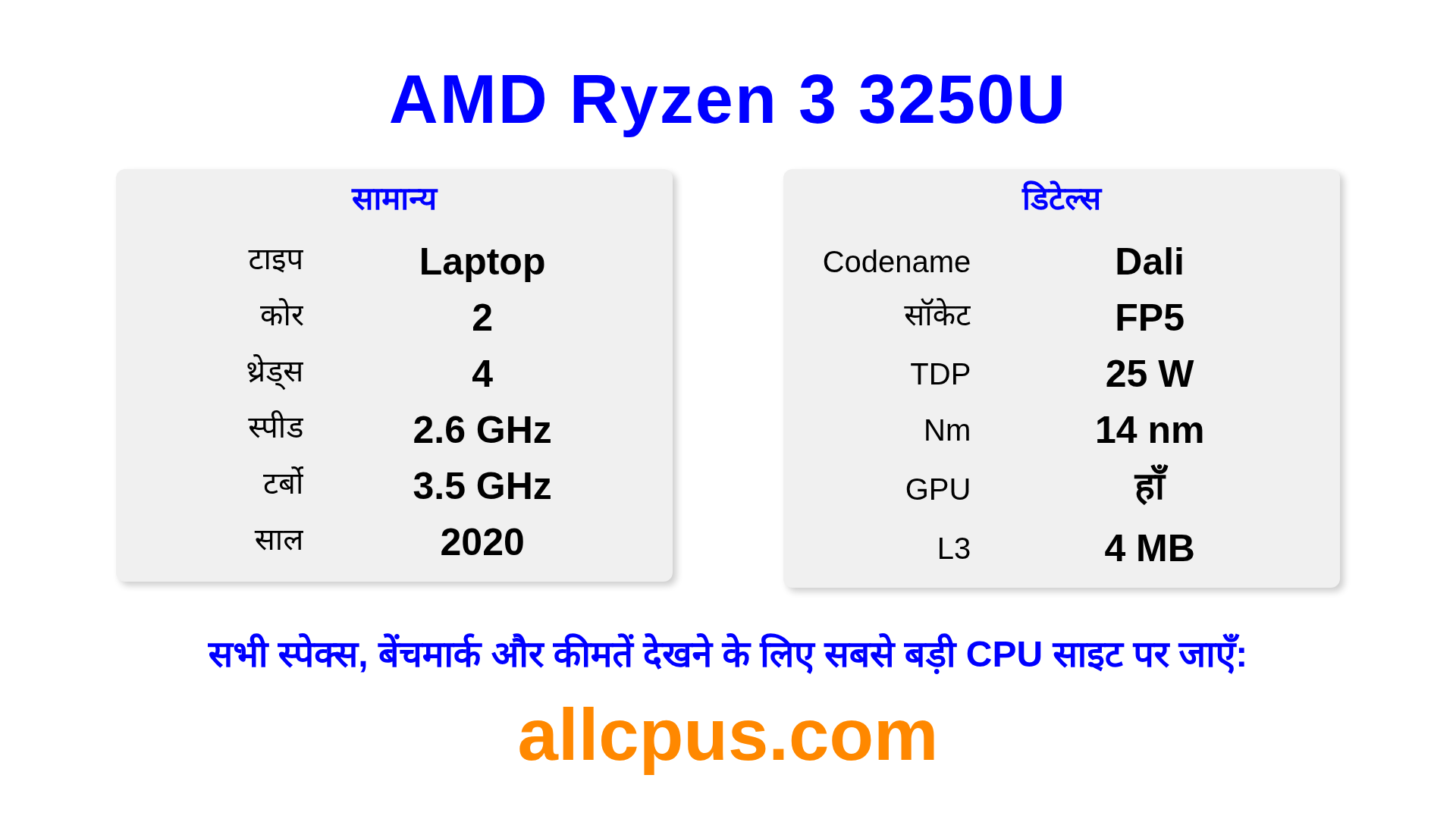 AMD Ryzen 3 3250U Ryzen लाइनअप का AMD लैपटॉप प्रोसेसर है, Dali आर्किटेक्चर पर आधारित और 2020 में जारी किया गया। इस CPU में 2 कोर, बेस क्लॉक 2600 MHz, अधिकतम टर्बो फ्रीक्वेंसी 3500 MHz और 4 MB L3 कैश है। 14 nm प्रोसेस टेक्नोलॉजी का उपयोग करके निर्मित। AMD Ryzen 3 3250U FP5 सॉकेट के लिए डिज़ाइन किया गया है।यह ओवरक्लॉकिंग को सपोर्ट करता है। इसमें इंटीग्रेटेड AMD Radeon Graphics ग्राफिक्स शामिल है।