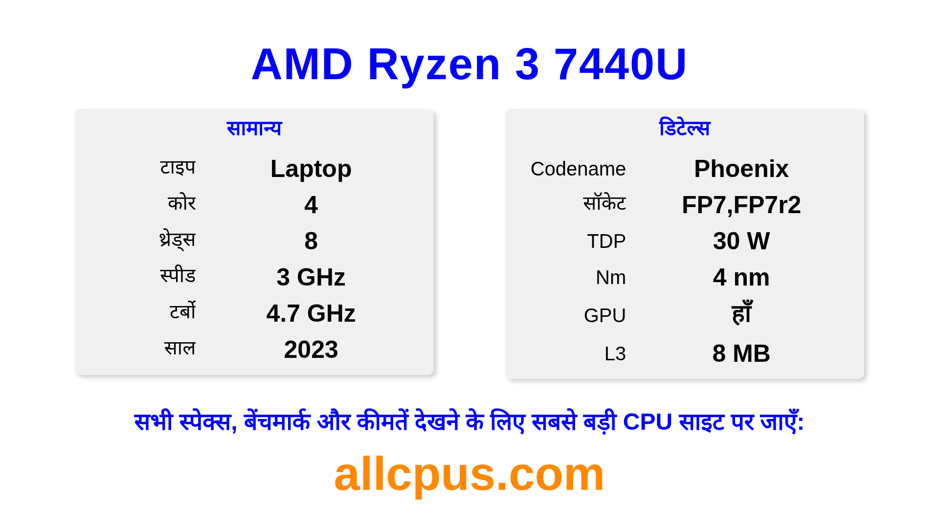 AMD Ryzen 3 7440U Ryzen लाइनअप का AMD लैपटॉप प्रोसेसर है, Phoenix आर्किटेक्चर पर आधारित और 2023 में जारी किया गया। इस CPU में 4 कोर, बेस क्लॉक 3000 MHz, अधिकतम टर्बो फ्रीक्वेंसी 4700 MHz और 8 MB L3 कैश है। 4 nm प्रोसेस टेक्नोलॉजी का उपयोग करके निर्मित। AMD Ryzen 3 7440U FP7,FP7r2 सॉकेट के लिए डिज़ाइन किया गया है। इसमें इंटीग्रेटेड AMD Radeon 740M ग्राफिक्स शामिल है।