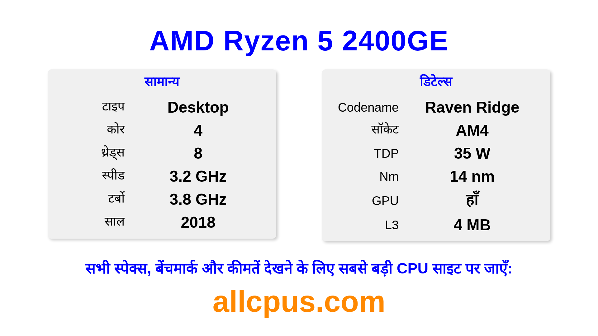AMD Ryzen 5 2400GE Ryzen लाइनअप का AMD डेस्कटॉप प्रोसेसर है, Raven Ridge आर्किटेक्चर पर आधारित और 2018 में जारी किया गया। इस CPU में 4 कोर, बेस क्लॉक 3200 MHz, अधिकतम टर्बो फ्रीक्वेंसी 3800 MHz और 4 MB L3 कैश है। 14 nm प्रोसेस टेक्नोलॉजी का उपयोग करके निर्मित। AMD Ryzen 5 2400GE AM4 सॉकेट के लिए डिज़ाइन किया गया है।यह ओवरक्लॉकिंग को सपोर्ट करता है। इसमें इंटीग्रेटेड Radeon RX Vega 11 Graphics ग्राफिक्स शामिल है।