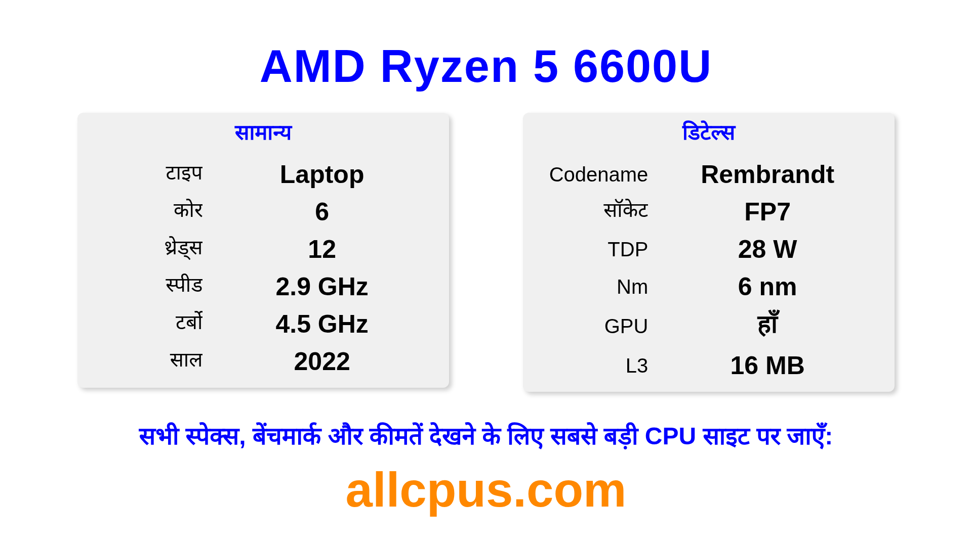 AMD Ryzen 5 6600U Ryzen लाइनअप का AMD लैपटॉप प्रोसेसर है, Rembrandt आर्किटेक्चर पर आधारित और 2022 में जारी किया गया। इस CPU में 6 कोर, बेस क्लॉक 2900 MHz, अधिकतम टर्बो फ्रीक्वेंसी 4500 MHz और 16 MB L3 कैश है। 6 nm प्रोसेस टेक्नोलॉजी का उपयोग करके निर्मित। AMD Ryzen 5 6600U FP7 सॉकेट के लिए डिज़ाइन किया गया है। इसमें इंटीग्रेटेड AMD Radeon 660M ग्राफिक्स शामिल है।